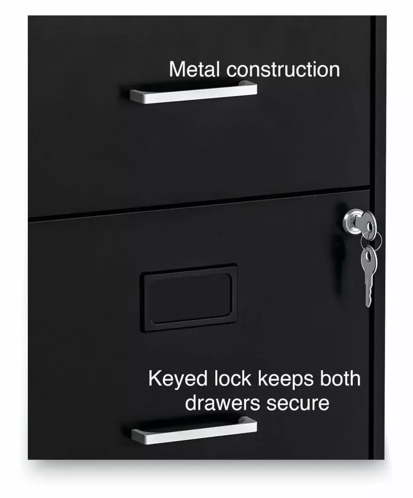 - 24.1H x 14W x 18D. Two-drawer light duty filing cabinet holds letter size documents..