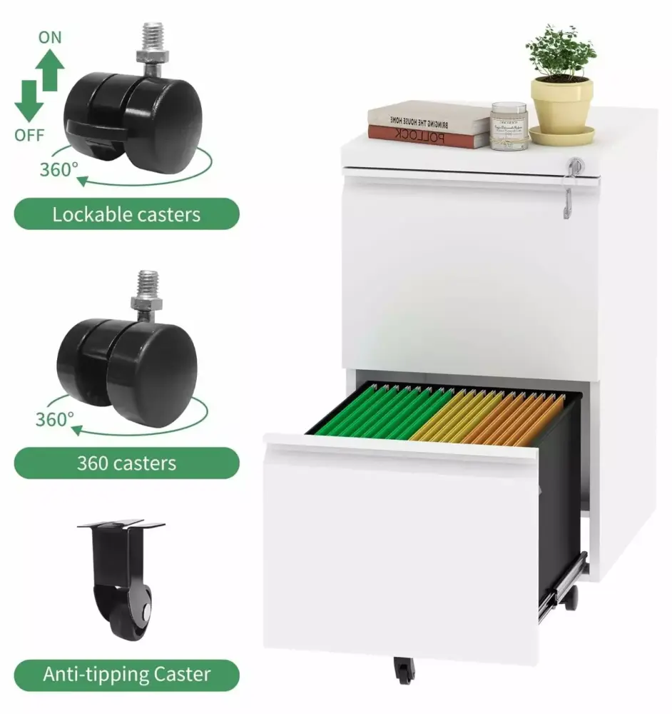 - Rolling Fill CabinetThis 2 drawer under desk file cabinet equipped with 2 lockable casters. 2 x 360 swivel casters and1x anti-tilt wheel. The anti-tilt caster to prevent tipping over. You can easily move the cabinet with wheels. making it easy for you to move to another place.