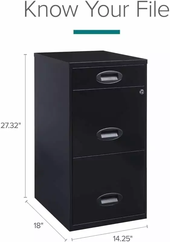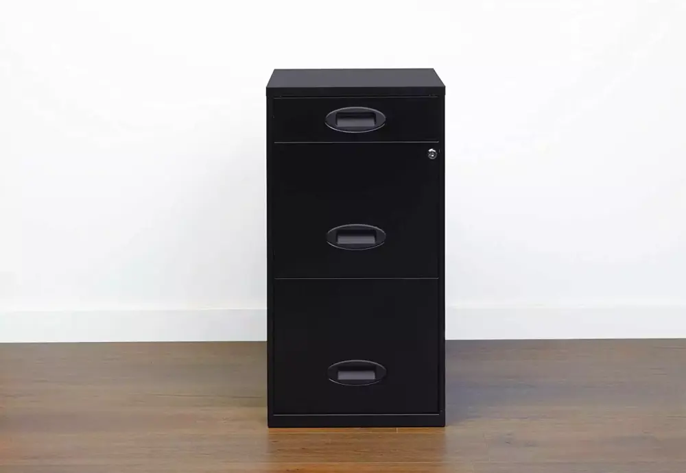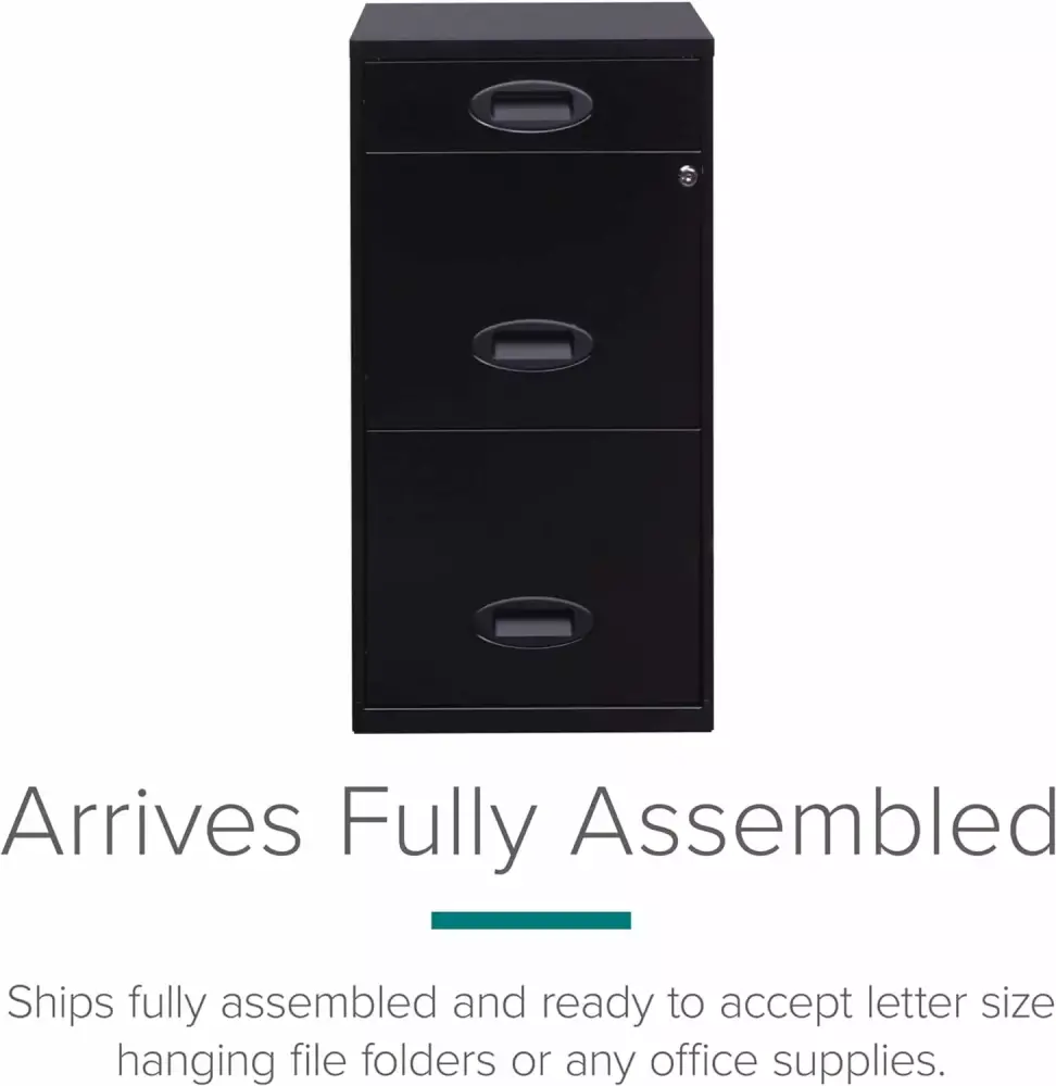 The Three Drawer Metal Vertical File Cabinet is the ideal storage solution for any small office or home office. Featuring two file drawers and an additional small storage drawer. this file cabinet is the perfect solution for your home office needs. This file cabinet features a smart. efficient design that works well in smaller spaces. and fits under most work surfaces or desks. Each drawer features high-sides to accommodate letter sized hanging files. The top pencil drawer can also be perfect storage for other office essentials. Using a patented glide suspension. the drawers have a smooth open and close slide with a three-quarter drawer extension. In addition. you can keep your files and possessions secure by using the built-in lock for both drawers. Painted steel surface is non-porous and easy to clean. Bring organization and function to your home or office with this three-drawer file cabinet.