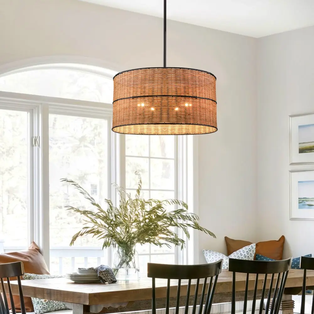 This magnificent chandelier is a perfect blend of style and functionality. It comes with 4 light heads and is crafted from rattan, presenting a unique texture. The drum-shaped design adds a touch of elegance. The non-KD lampshade not only simplifies the installation process but also showcases the integrity of its craftsmanship. With its distinct Bohemian and unadulterated pastoral styles, it can effortlessly enhance the aesthetic of any space. ETL-certified, it ensures safety and durability. Whether placed in the bedroom for a cozy ambiance, the living room to create a warm gathering atmosphere, or the entrance hall to welcome guests with charm, this chandelier is a wonderful choice that brings a natural and artistic allure to your home.
