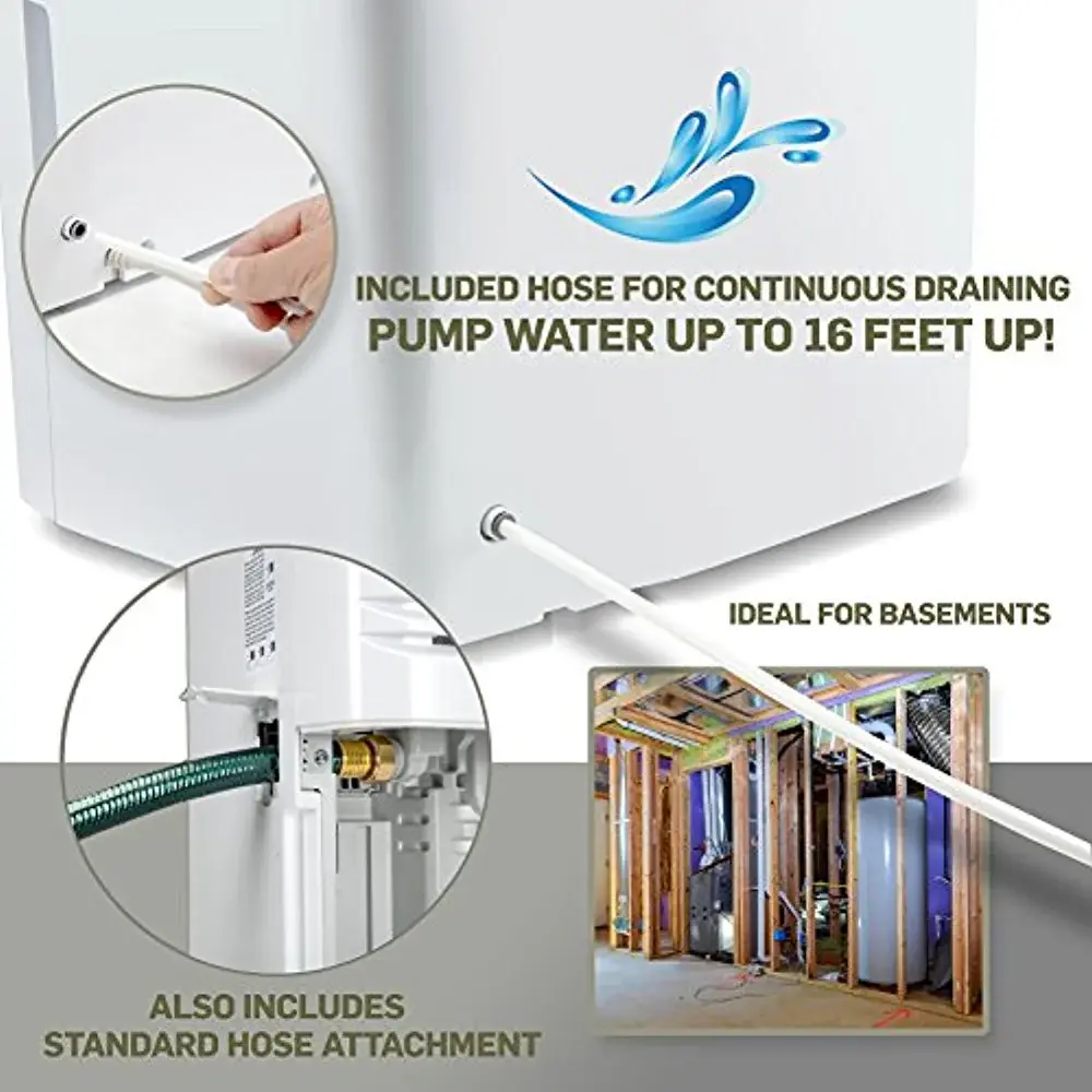 Features an productive 16-watt built-in pump capable of pumping water as high as 16,4 feet vertically. This allows for continuous upward drainage to drain moisture out of a basement window or into a sink.
