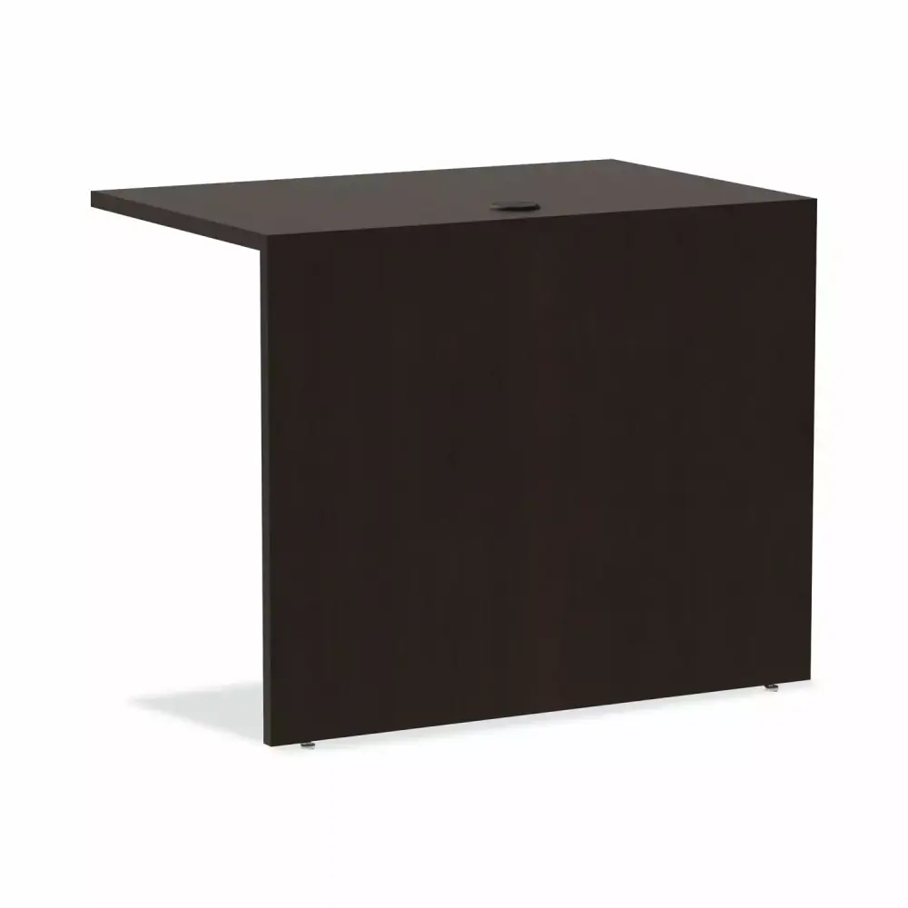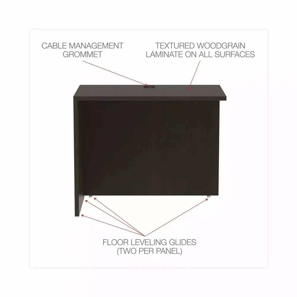 Universal application office furniture piece that can be used as either as a return or bridge to create "U" or "L" shaped workstations. Durable. 1” thick worksurface and side panels are water. scratch and dent-resistant. Full-height modesty panel. Flexible design that adapts to right or left-handed configurations. Fitted with one wire management grommet to keep cords tucked away for increased organization and safety. Protective 3 mm edge banding. Base Material: Textured Woodgrain Laminate; Color Family: Brown; Color(s): Espresso; Depth (Max): 23.63"; Edge Detail Profile: 3 mm Protective Edge Banding; For Use With: Alera® Valencia Series Desk Shells. Credenza Shells. Corner Credenza Shells. File Pedestals. Center Drawers and Keyboard/Mouse Shelf.