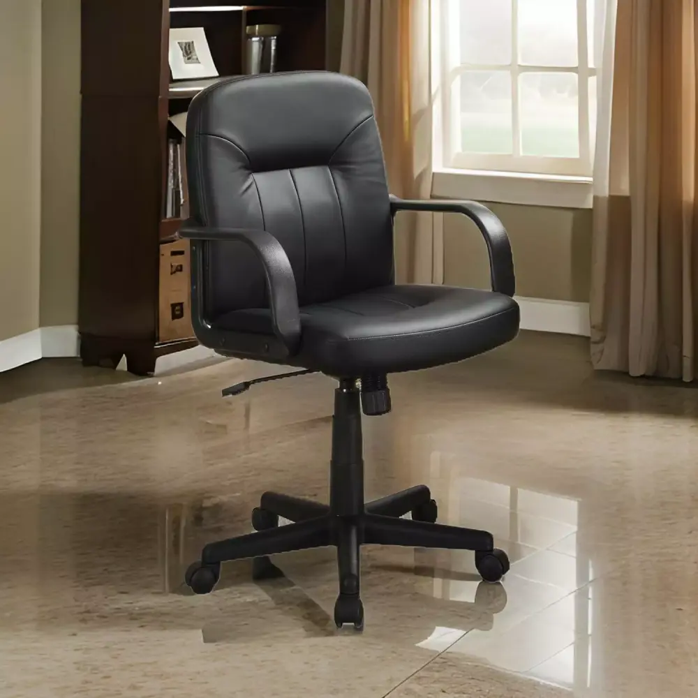 Get The Comfort Needed To Perform All Work Tasks In This Stylish Black Medium-Back Office Leather Chair Fitted With Side Bolster For Added Support. The Chair Has A Medium Back Height With Leather-Look Upholstery. The Padded Seat And Back Make The Chair Comfortable To Sit In For Long Periods Of Time. The Chair Features Adjustable Seat Height And Chair Tilt To Provide An Impressive Level Of Customizable Comfort. A Great Addition To Your Workspace.Includes: 1 Chair Only.- SKU: BNZ34212