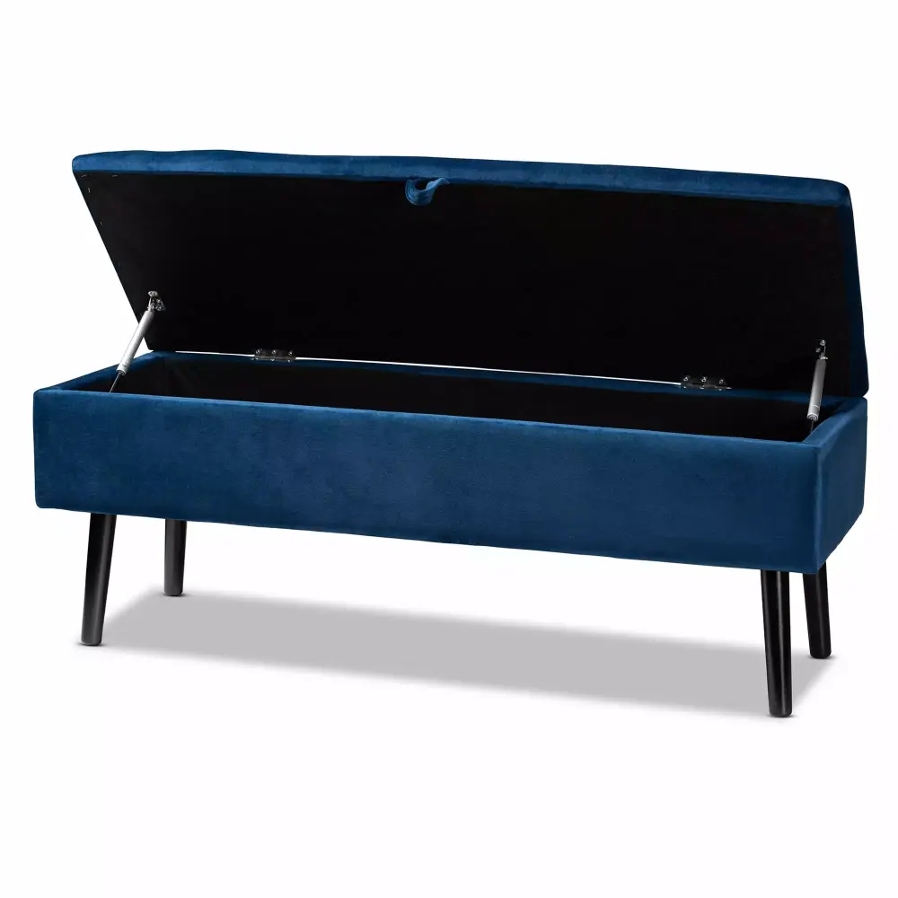 Stylish and practical. the Caine storage bench expands the potential of any interior space. Made in China. this bench is comprised of a sturdy wood frame padded with foam and upholstered in sumptuous velvet fabric. The button-tufted cushion opens to reveal a spacious storage compartment for extra pillows. blankets. and more. Requiring assembly. the Caine utilized angled legs for excellent stability and support while lending a traditional feel. A wonderful addition to a living room. bedroom. or entryway. the Caine storage bench enhances any space.