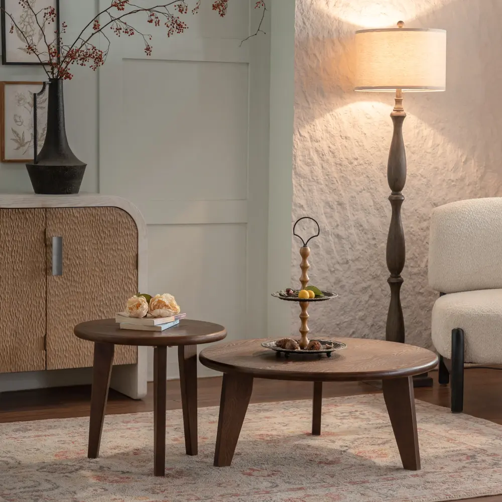Elevate your home decor with this elegant round coffee table, featuring a spacious single-color wood top that provides a generous surface for displaying decor items or enjoying beverages. Its deep wood finish adds a touch of sophistication, seamlessly fitting into both living room and bedroom settings. The sturdy three-legged base, crafted from solid wood, ensures stability while enhancing the table’s unique charm. Perfectly blending cutting-edge and rustic styles, this coffee table is a versatile and stylish addition to any space, offering both functionality and aesthetic appeal.