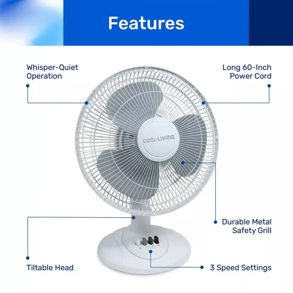 - HIGH-PERFORMANCE DESK FAN: Our fan offers wide-area oscillation to cool an entire room. It includes 3 speed settings, a fan head that tilts up and down, a durable metal safety grill, and a 60-inch power cord.