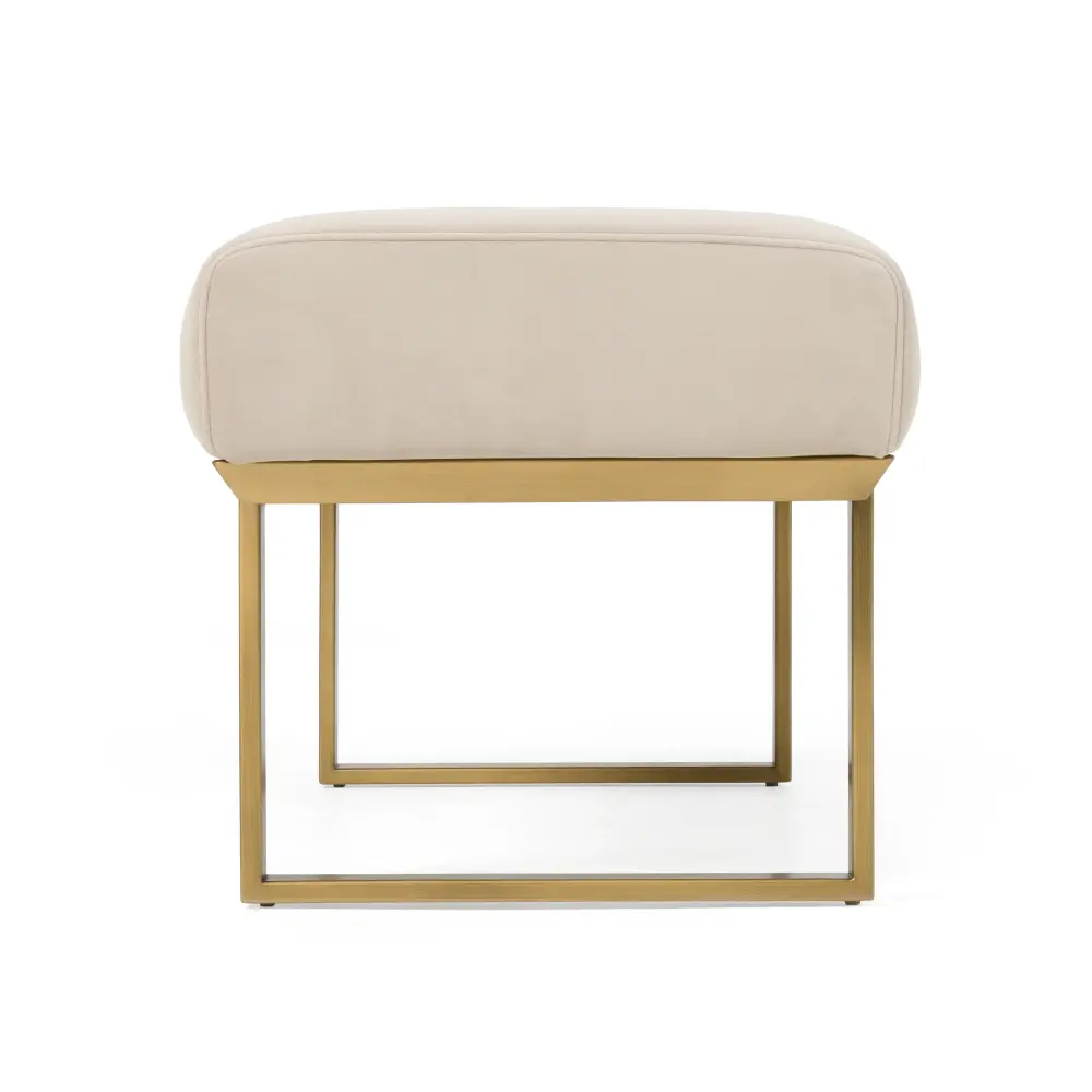 The Modrest Robles Present-day Beige Fabric and Antique Brass Dining Bench is a sublime blend of understated elegance and functional design. Upholstered in a soft sand fabric, this bench exudes sophistication while offering plush seating comfort. The antique brass base provides a touch of timeless glamour, elevating its modern aesthetic. Whether placed in a dining area, entryway, or bedroom, the Robles bench serves as both a practical addition and a statement piece, transforming any space into a sanctuary of contemporary refinement.
