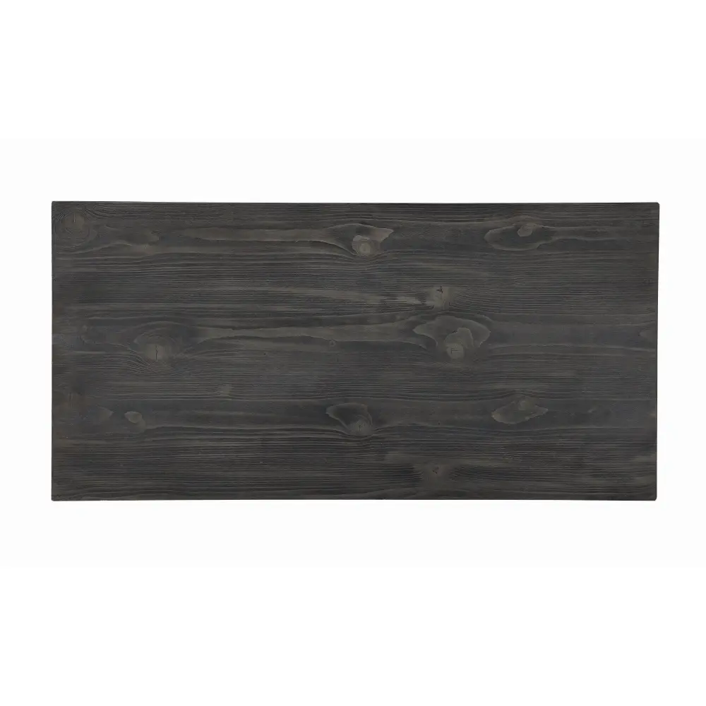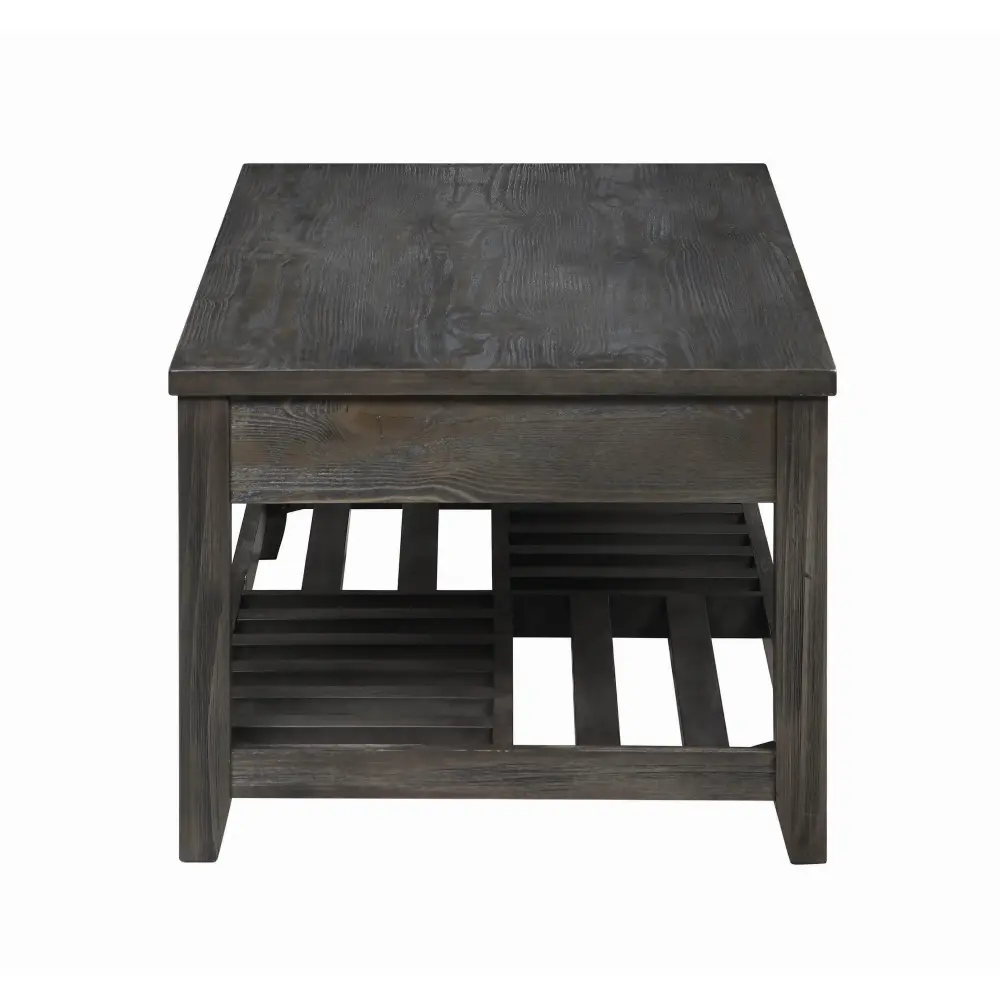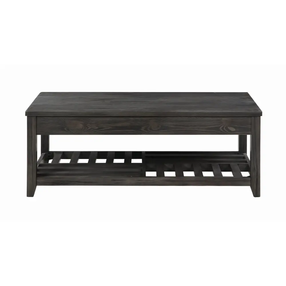 This coffee table blends clean lines with a spacious, functional design. The rectangular tabletop provides ample room for decor or serving essentials, making it perfect for gatherings. A slatted lower shelf with a checkerboard-inspired design offers spare storage and a creative touch. Crafted from enduring engineered wood with pine veneer, it features a grey finish with wood grain accents, adding rustic charm to any living room. Tapered legs comprehensive the timeless appeal of this versatile piece.