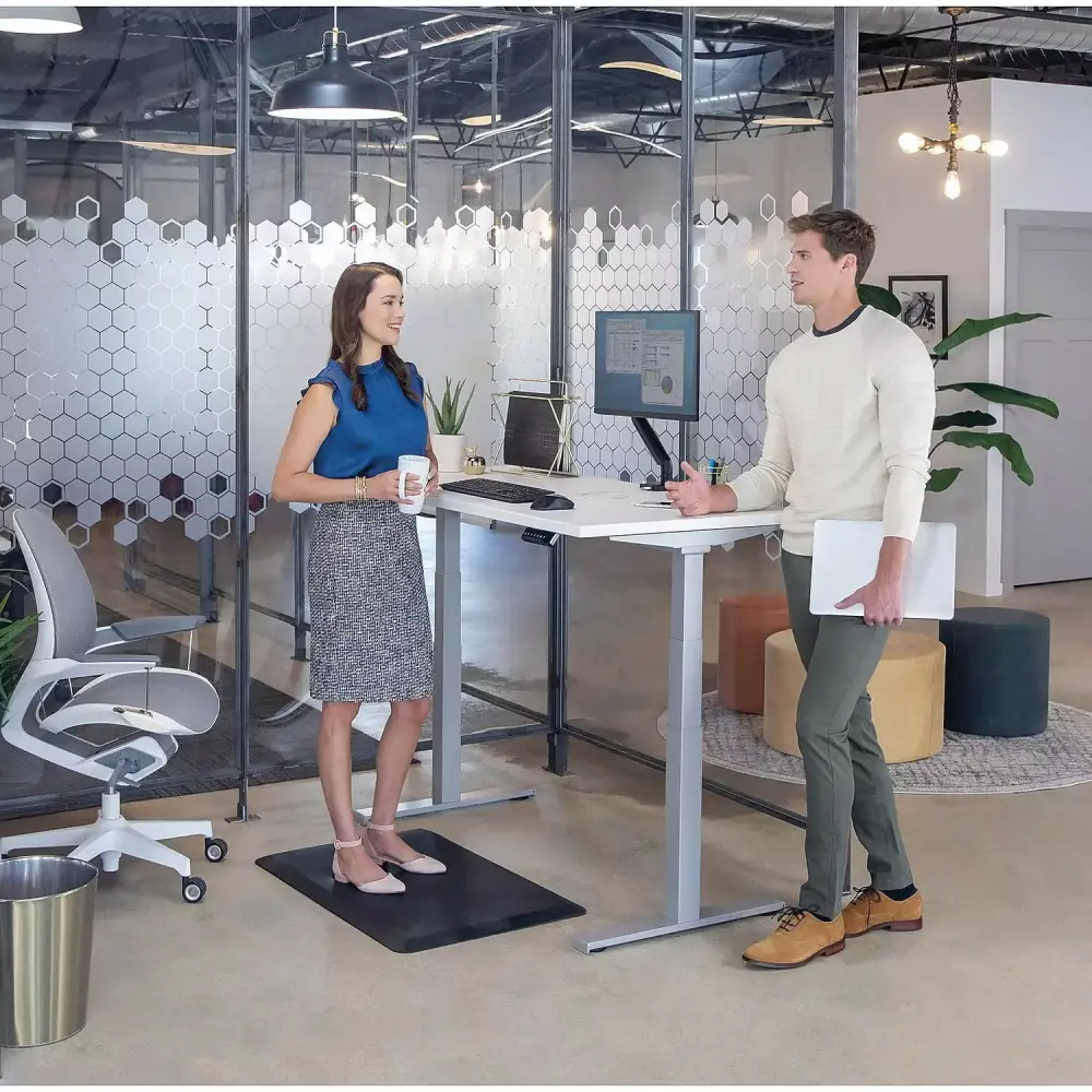 Easily go from sitting to standing with handset that features three programmable memory settings. Increase activity with optional alert to remind you to alternate between sitting and standing. Quiet yet powerful motor provides height adjustment from 24.75 C 50.25 high with stable 3-stage legs (ADA Compliant). Commercial grade. steel base holds up to 176 lbs. and provides enhanced stability. Collision detection safety feature enhances workplace safety. High Pressure Laminate (HPL) surface is easy to clean and designed to be resistant to dents/chips. UV rays. stains and scratches. 15 Year Structural. 7 Year Mechanical Warranty. Includes height adjustable base and 60 x 30 white top.