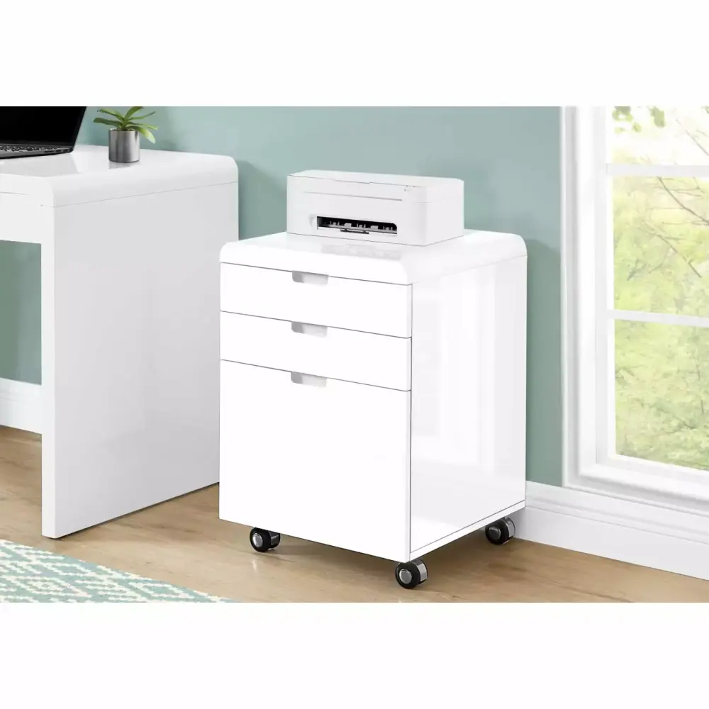 Complete your workstation with this compact and functional mobile file cabinet with a modern white gloss finish. Easy on the eyes. it can be placed anywhere thanks to smooth caster wheels. You can also complete your desk and cabinet ensemble with the matching office desk. Also useful as a printer stand. this filing cabinet is there for you to help you reach your potential no matter the task at hand. Two convenient letter sized drawers easily accommodate files. papers. letters. or books. while the third and bottom drawer handles legal sized documents so that you have multiple convenient storage options. Accented with simple modern handles. this unit has no lack of style.