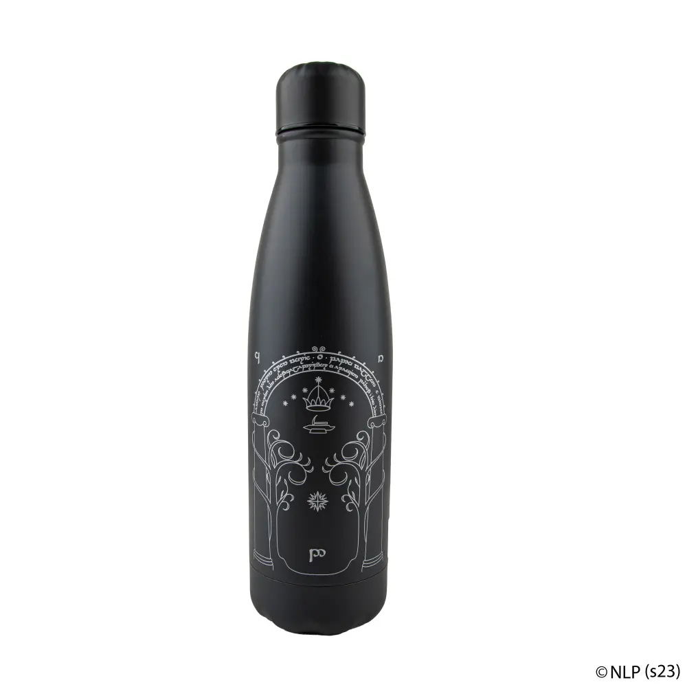 Perfect for seasoned fans of the epic saga The Lord of the Rings, this water bottle is a practical merchandise to have. The classic and notable graphic features the west gate of Moria when reflected with the moonlight and the Elvish inscription that holds the password of the gate writes “The Doors of Durin, Lord of Moria.. Speak friend and enter.”.