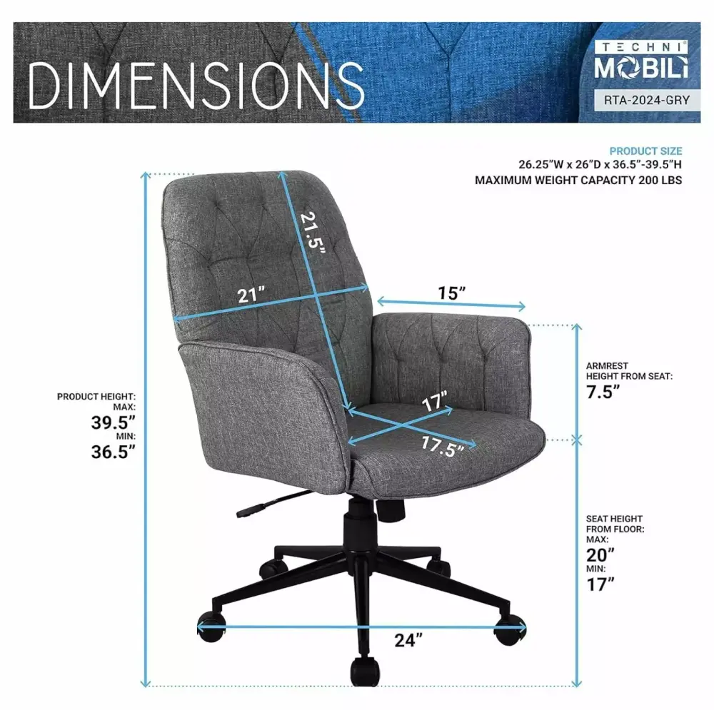 Take a seat as you tackle your to-do list with this Home & Office chair. Gexandy offers the perfect pick for your place. The chair has fixed contoured armrests and is itself wrapped in polyester blend upholstery showcasing a versatile solid hue. while tufted details dot the back for a touch of texture. Its features include pneumatic seat height adjustment. tilt mechanism with tension control. and swivel. The 5-star durable steel base and non-marking caster below round out the design and let you glide from task to task with ease. It comes with 2-year limited warranty and weight support up to 200 lbs.