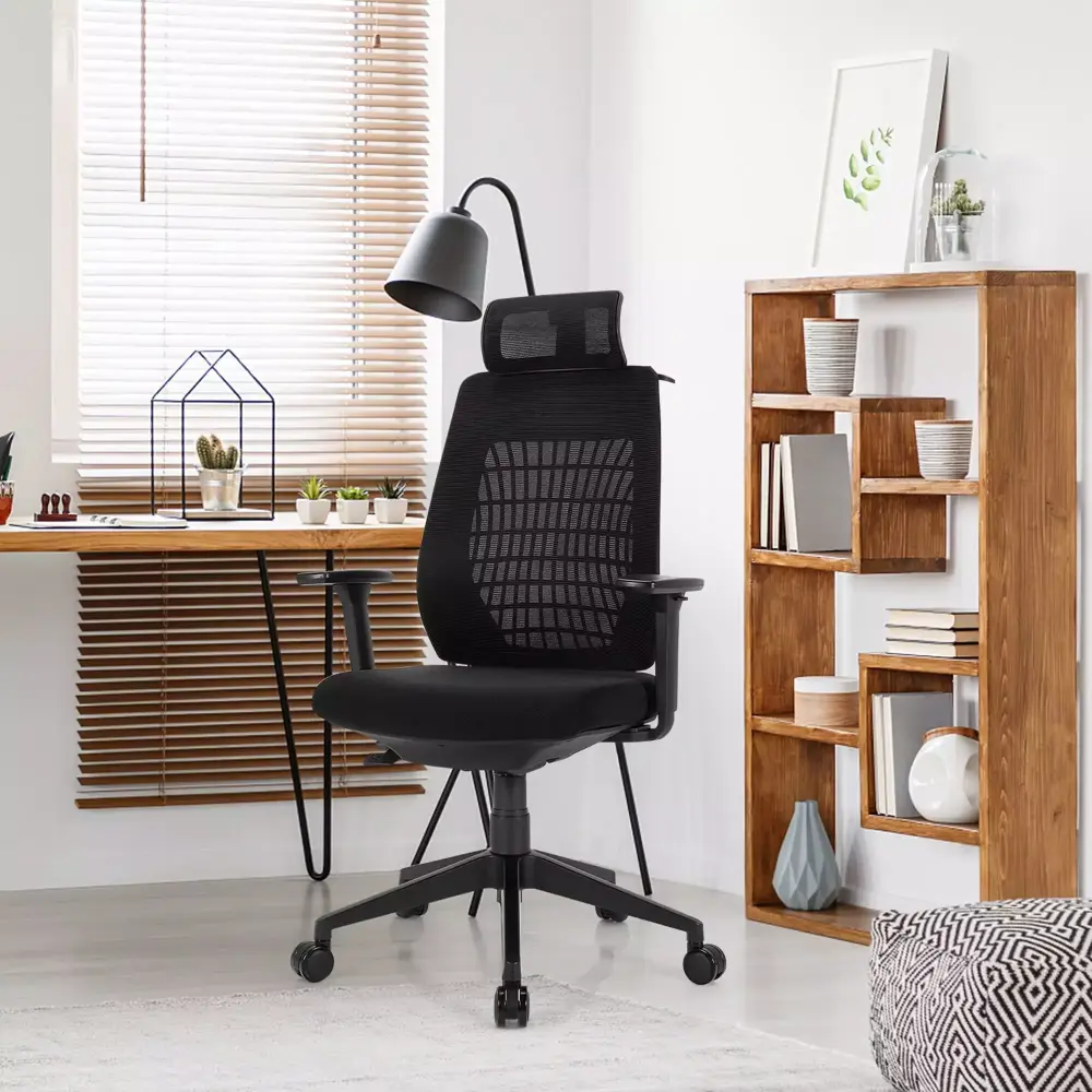 This mesh home office chair will be a perfect partner for you whether you are working. studying. gaming or resting. The ergonomic backrest perfectly conforms to the curve of the body to achieve optimal comfort. High elasticity and breathable mesh fabric provides strong support and cool sitting experience. The rotatable headrest and 3D adjustable armrests allow you to find a perfect position for various tasks. Besides. supported by a sturdy 5-claw base and a high quality gas rod. this office mesh chair ensures strong stability and load capacity. The humanized clothes hanger helps to hang your clothes without wrinkles. What’s more. the seat height and back tilt angle can be easily adjusted to meet your ideal position.
