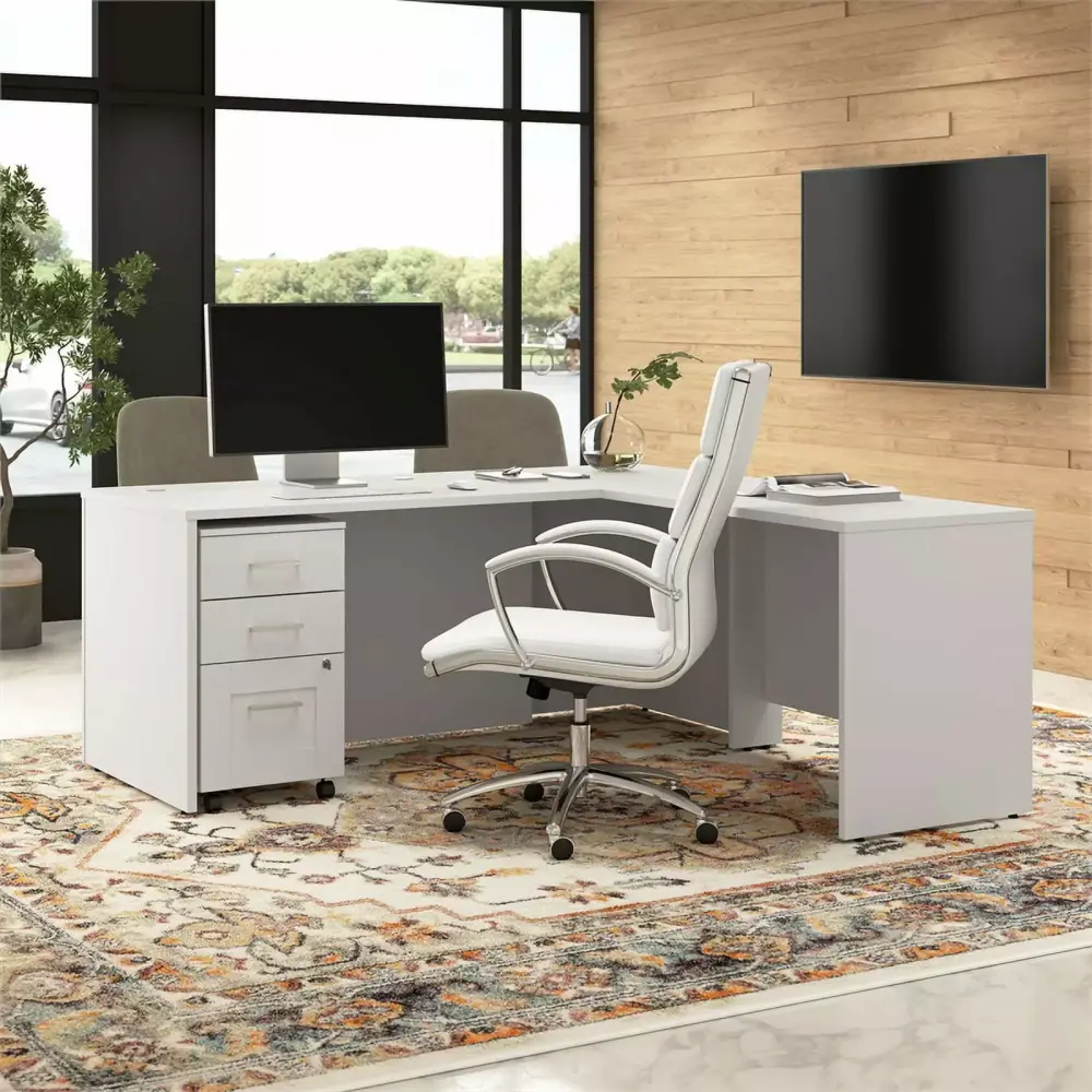 Highlighted by its distinctive breakfront design. the Bush Business Furniture Hampton Heights 72W x 30D Executive L-Shaped Desk with 3 Drawer Mobile File Cabinet is the perfect desk set. L-Shaped Computer Desk offers plenty of room to spread out. Return attaches to either side of the desk to create L or U Shaped configurations. Your choice of Matte Brushed Brass or Brushed Nickel hardware (both included in your order) allow you to personalize your desk set. Shaker style designs and a fresh finish work perfectly in transitional and contemporary interiors. Locking File Cabinet’s bottom drawer accepts letter. legal and A4-size papers while two box drawers store small office supplies. Bush Business Furniture’s commitment to safety includes rigorous testing that meets or exceeds ANSI/BIFMA standards. Backed by a 10 Year Warranty. North American made with globally sourced materials.