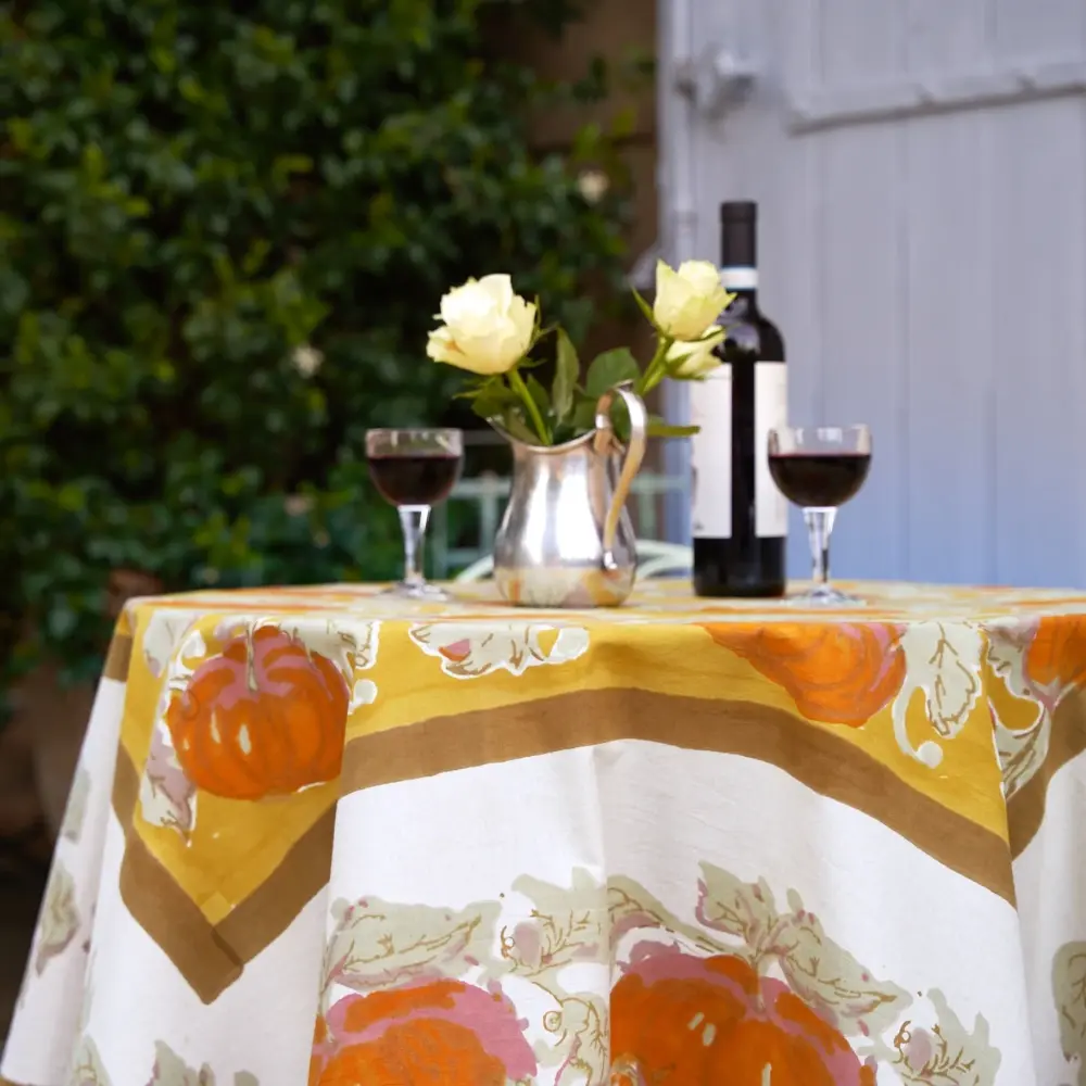 With rich autumnal colors and vibrant pumpkin imagery, this finely crafted linen adds a sense of seasonal delight to the table, ideal for entertaining guests during the fall months and beyond. Every one of these superior French linens is carefully handprinted by skilled artisans using a time-honored technique, resulting in a singular piece of craftsmanship.