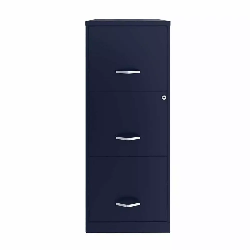 The 3 Drawer Metal File Cabinet in Navy is the perfect design for small office or home office use. This file cabinet is a smart. efficient design for smaller spaces. This cabinet features three high-side drawers which accommodate letter-size hanging files. The drawers can also be the perfect storage solution for other office essentials. Each drawer features a patented glide suspension for a smooth open and close motion and a three-quarter drawer extension to help you locate your files easier. In addition. you can keep your files and possessions secure by using the built-in lock for both drawers. Painted steel surface is non-porous and easy to clean. Bring organization and function to your home or office with this stylish three-drawer file cabinet. Your supplies and files will always be organized and within reach!