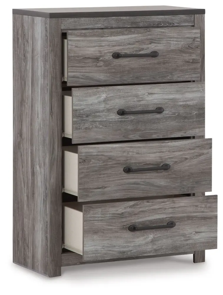 Alluring smoky gray hues create an ambiance that just feels right. This 4-drawer chest has a charming wood-like appeal enriched by a dual-tone, textured look. Featherlight neutral shades contrasted by a dark charcoal finish bring a refined yet relaxed feel to contemporary decor and a sense of serenity to your space.
