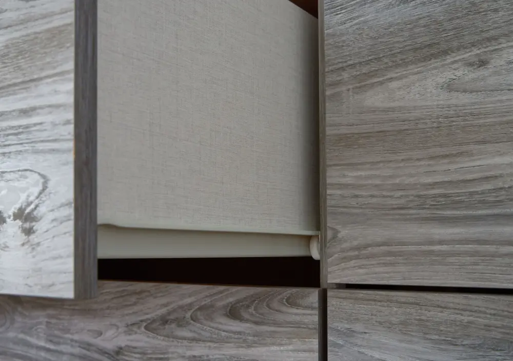 - Drawer interiors are lined with a faux linen laminate for a clean, finished look