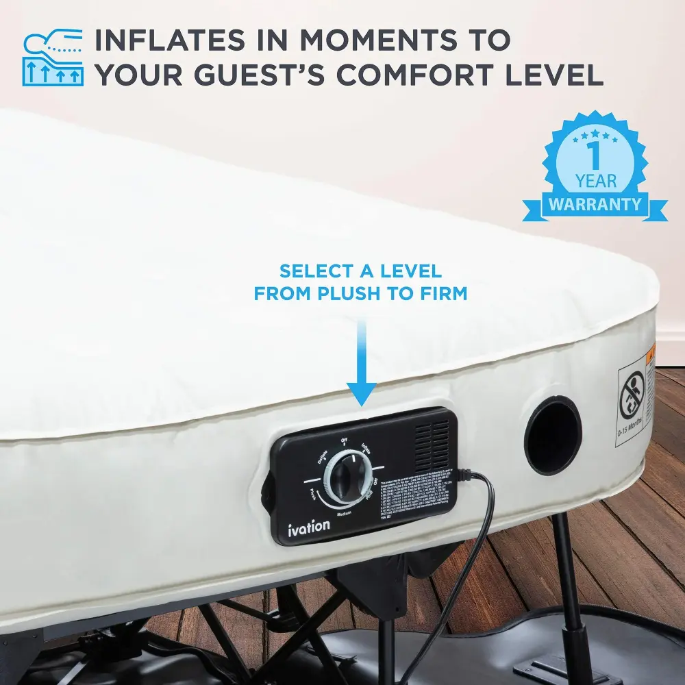 Whether you are welcoming house guests or adventuring into the great outdoors, comfortable, quality sleep is easier than ever with the Ivation EZ-Bed Inflatable Mattress with Legs & Carrying Case. Place up this camping air mattress quickly and easily with its self-deploying frame and automated air pump. The integrated frame folds out to lift your full air mattress off the ground, providing the comfort and feel of a permanent bed as you climb in and out. A puncture-resistant, polyester top and internal coils work with the 3 distinct comfort settings to provide a restful night of sleep. The tough construction of the air mattress with frame ensures continuous comfort for years to come.