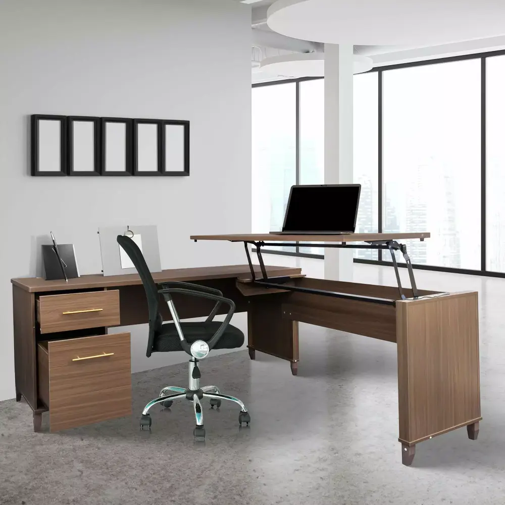 - Have a comfortable and productive workspace at home or in a small office with this ergonomic sit-to-stand L-shaped office desk