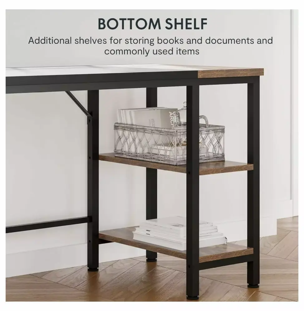 - LARGE ORGANIZED SPACE Large desktop provides enough space to place laptops. computers. keyboards. and daily necessities. 2 tiers of under-desk open shelves add extra space for storing books. files. and more.