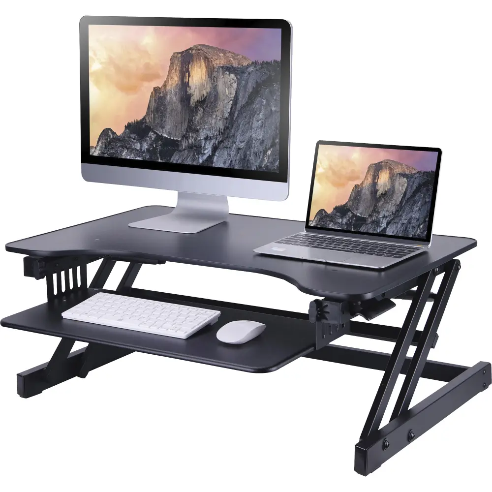Keep healthy and active at the workplace by standing and sitting during different parts of the day with the Lorell Adjustable Desk Riser (LLR81974). Sturdy construction supports up to 50 lbs. with the space for two monitors connected to a PC or a dock or a laptop and a monitor connected to each other. Beneath the top portion is a keyboard tray that not only moves up and down but also in or out for a comfortable typing position. Use the side levers to easily and smoothly raise and lower the adjustable computer riser to your preference. choosing from one of five possible positions. A gas spring allows for adjustment while the equipment is in place. The black monitor riser with a keyboard tray is fully assembled for added convenience. Simply place it on an existing desk top and keep it in one position. or change it as the day goes on.