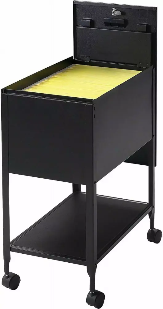Economy file is designed for letter-size hanging folders (sold separately). Design features a sliding cover. keylock to secure files. piano-hinge top and shelf storage on bottom. All units are keyed alike. Mobile file has four dual-wheel casters for easy mobility.