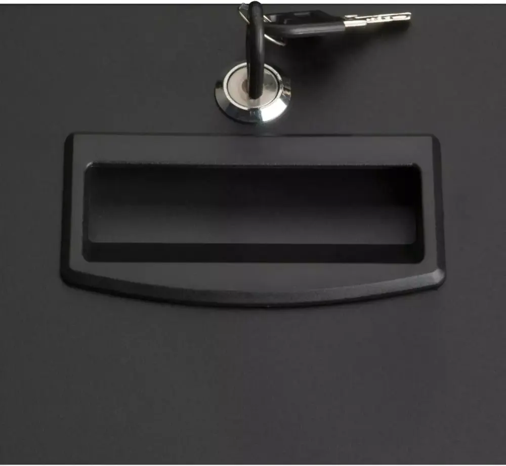 - Design features a sliding cover. keylock to secure files. piano-hinge top and shelf storage on bottom