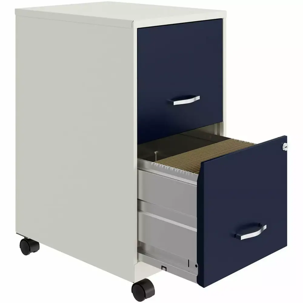 The Mobile 2-Drawer Metal two-tone File Cabinet in white/navy is designed for small office or home office use. The cabinet features a smart. efficient design that works well in small spaces and fits under most work surfaces or desks. Each drawer features high-sides to accommodate letter-sized hanging files. The drawers are also a perfect storage solution for other office essentials. Using a patented glide suspension. the drawers have a smooth open and close slide with a three-quarter drawer extension to prevent tipping. In addition. you can keep your files and possessions secure by using the built-in lock for both drawers. The additional wheels that come with this file cabinet are both stylish and functional which makes it easy to move around your home or office. Painted steel surface is non-porous and easy to clean. Bring organization and function to your home or office with this stylish mobile two-drawer file cabinet. Your supplies and files will always be organized and within reach!