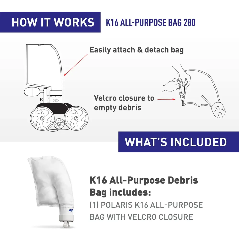 - WHAT’S INCLUDED: This is an individual Polaris K16 All-Purpose bag with Velcro closure. The bag is designed to keep debris in the bag during a cleaning cycle and for ease of opening and emptying. The K16 easily snaps onto the cleaner for easy installation.