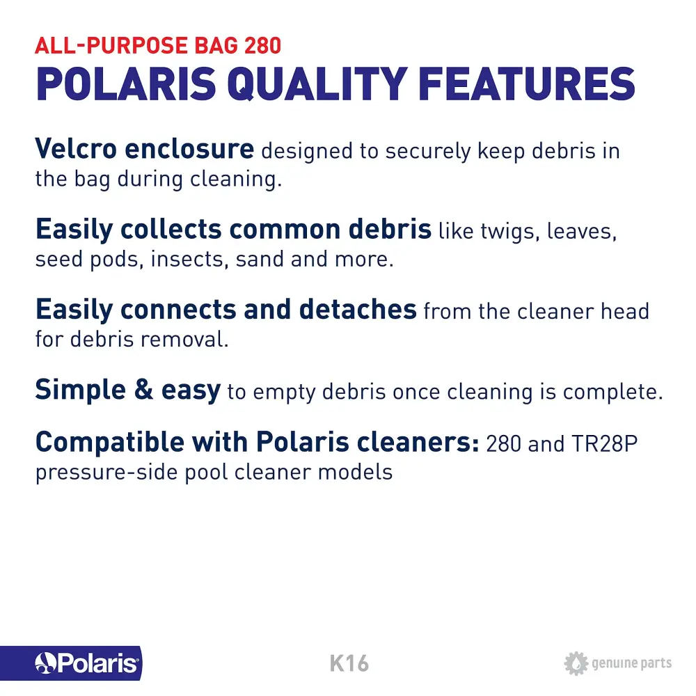 - PREMIUM PERFORMANCE: The Polaris K16 All-Purpose Bag is a Velcro sealed debris bag designed to capture common debris such as twigs, leaves, seed pods, insects, sand and more.