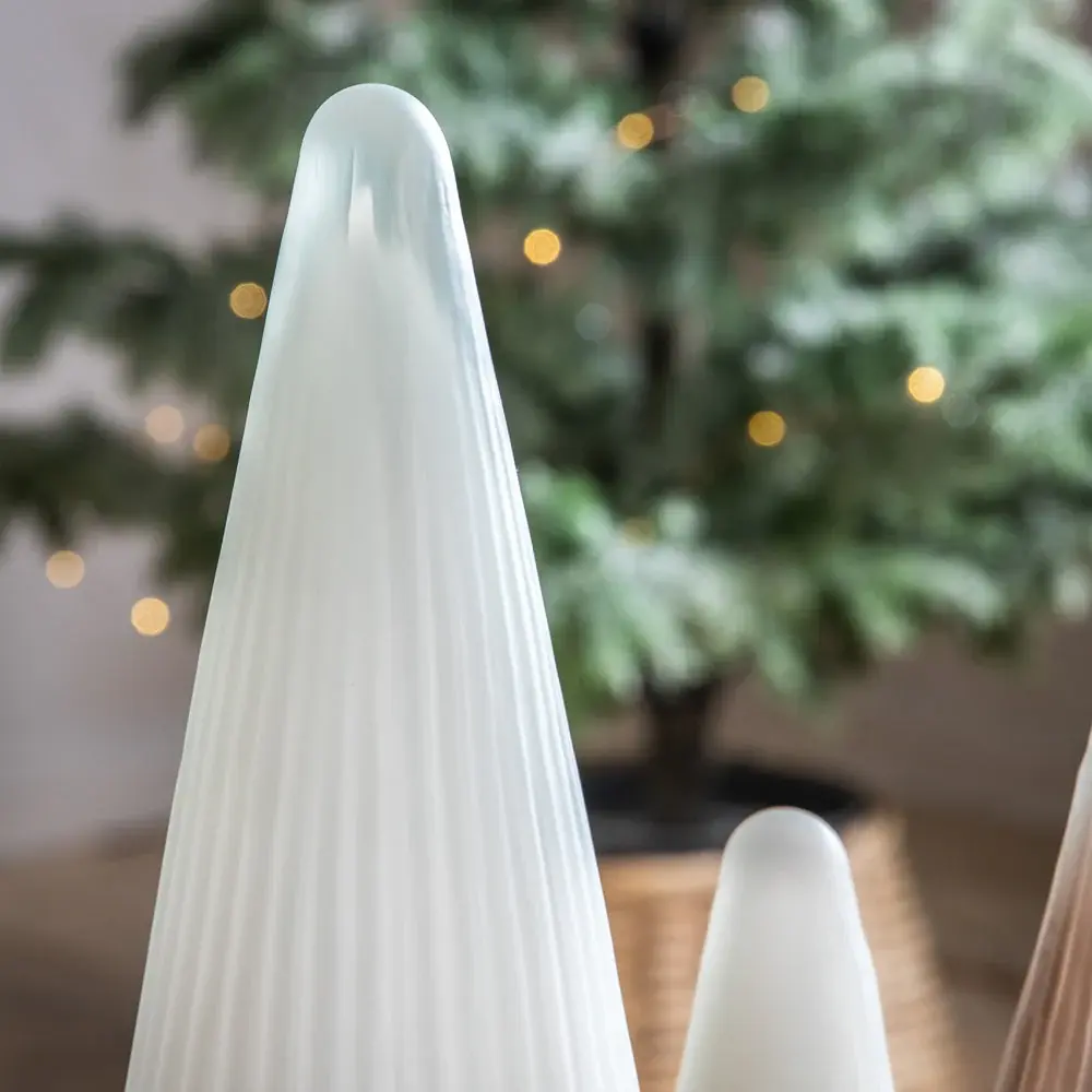 This stunning tree decoration offers a contemporary twist on a traditional tree. Featuring ridges that add texture to the beautiful white frosted glass, this decoration is perfect to place to any Festive display. Also available in a larger size and the pair look fantastic when styled together.