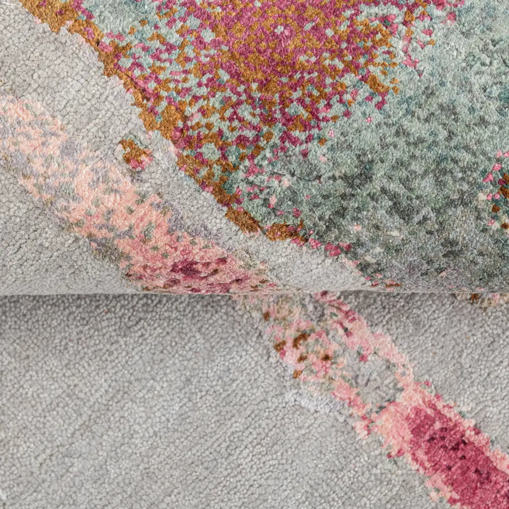 The design provides a blend of fluid, organic shapes and splashes in varying shades. Dominant fuchsia and lighter pink tones integrate with accents of sea green, gold, and bronze, creating a dynamic visual. This artistic arrangement gives the rug a look reminiscent of modern painted operates, with colors appearing to spread and overlap.