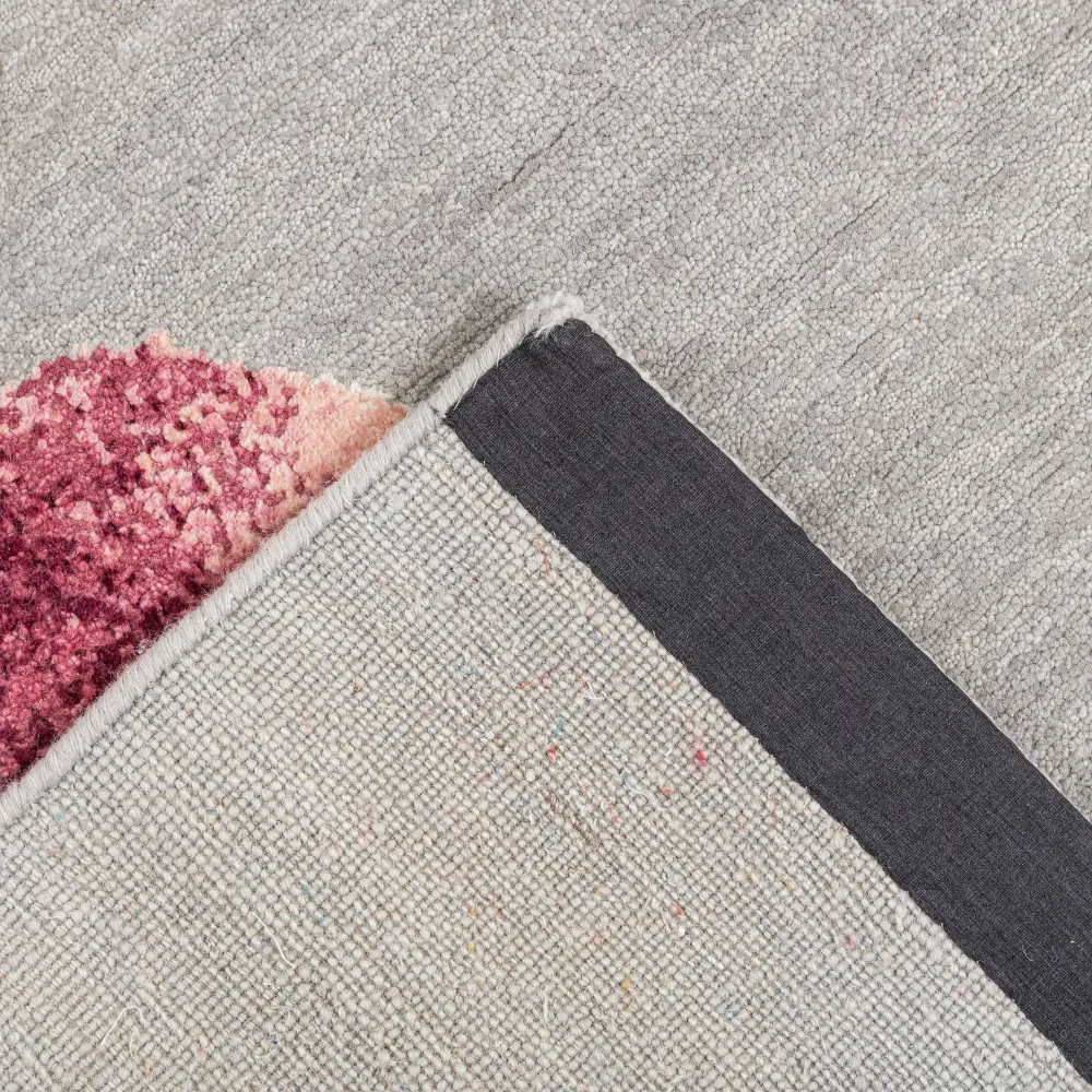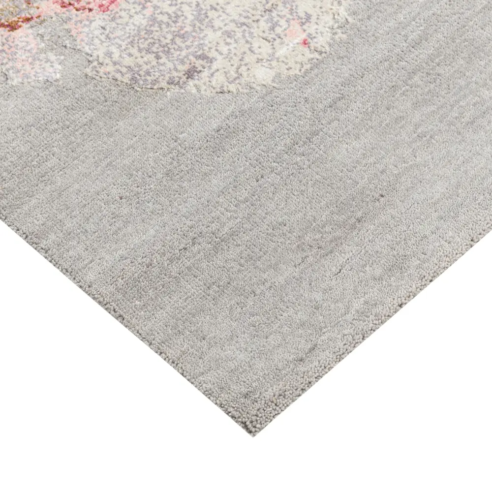 This contemporary silk rug, measuring 8′ x 10′, introduces an abstract design element to modern interiors. Its base is a light, neutral grey, providing a subtle foundation for the overall pattern.