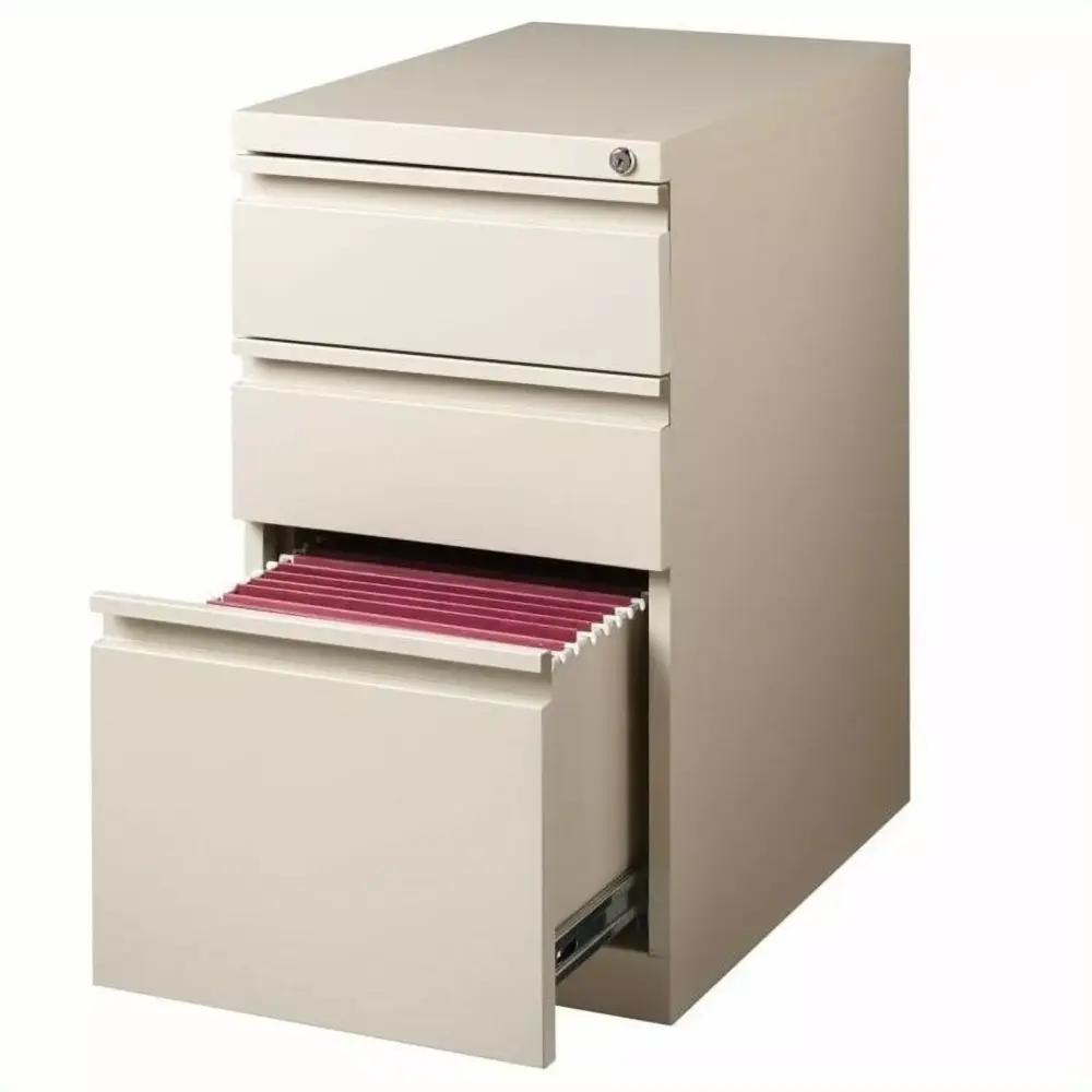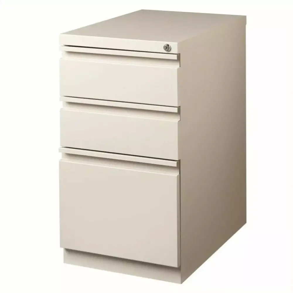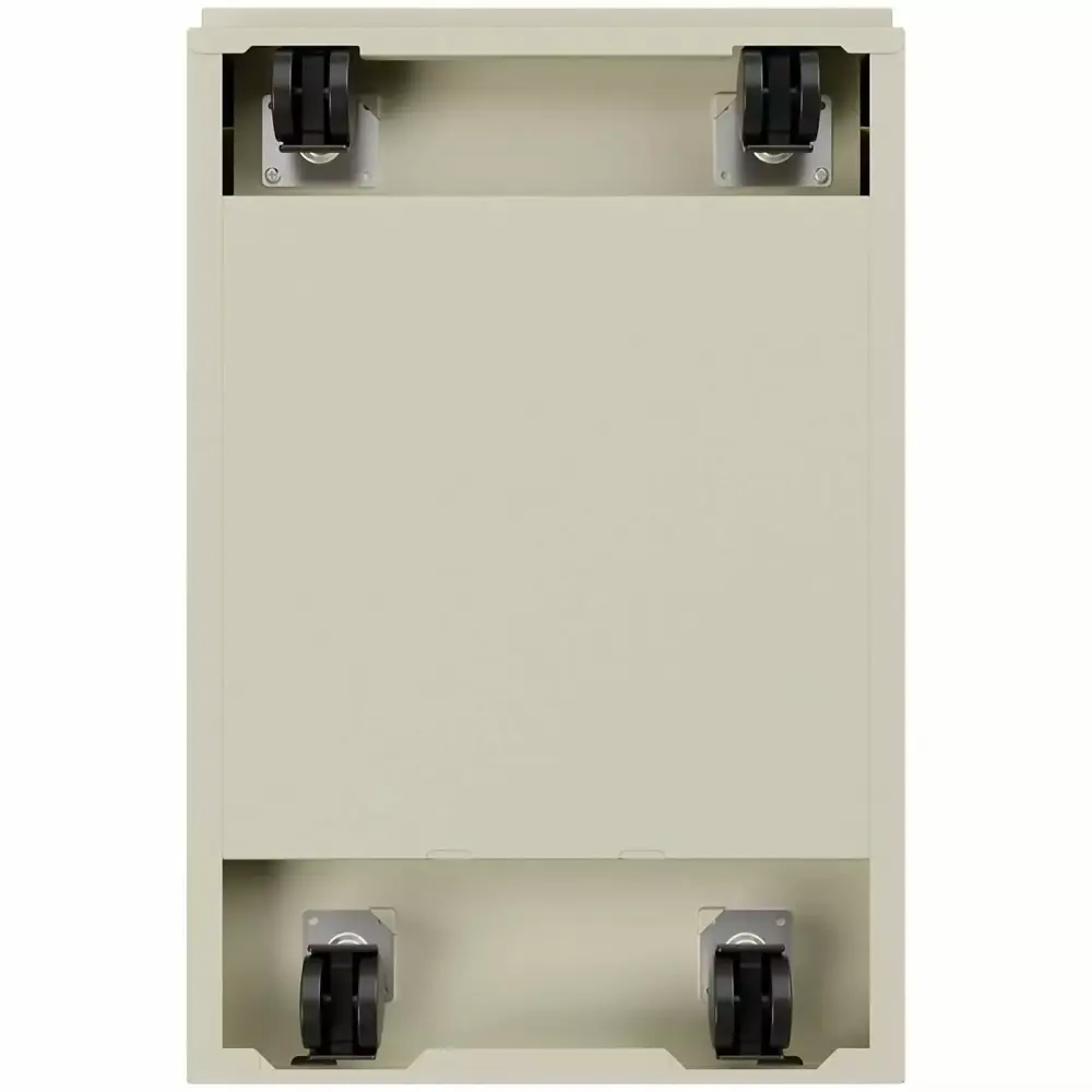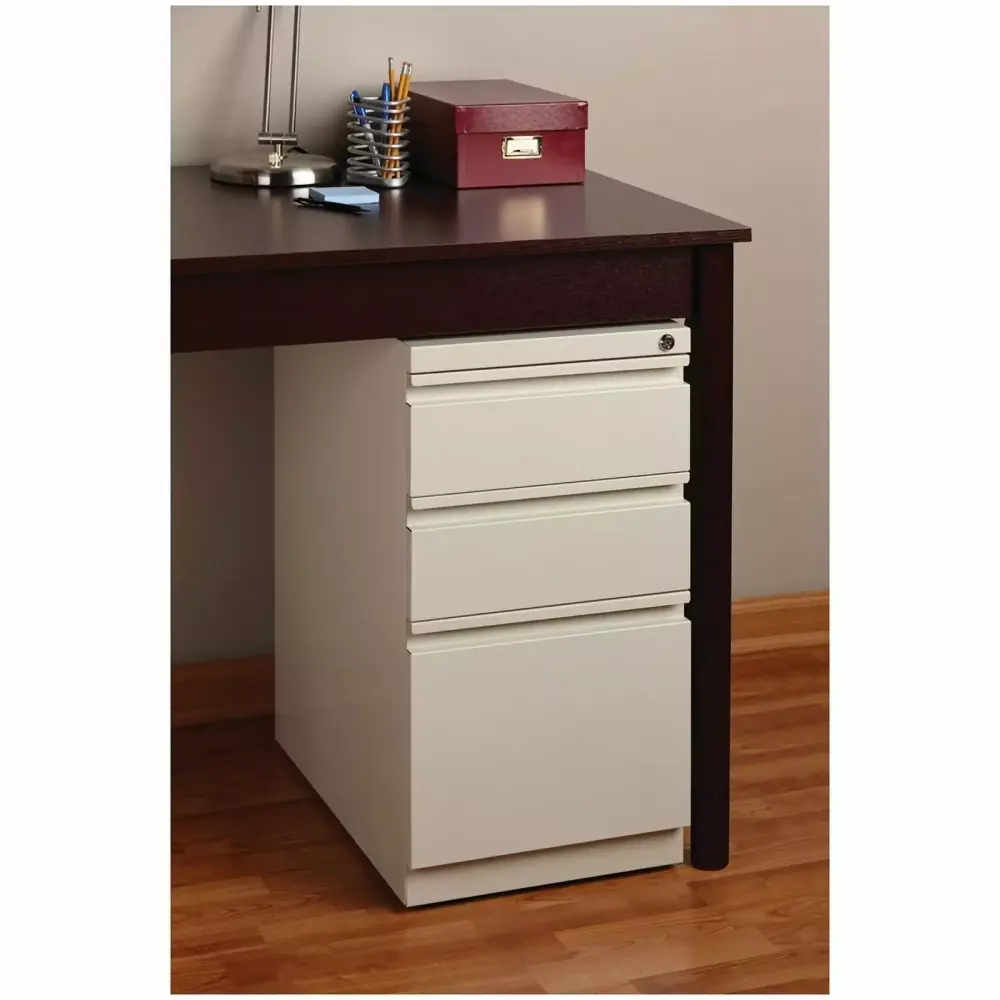 20-inch deep Metal Mobile Pedestal Files with a 3-drawer box/box/file drawer configuration in putty/beige are designed to support the demand of today’s office. Durable. fully assembled steel construction with non-porous surface is easy to clean and sanitize. These commercial grade mobile pedestals come standard with factory installed hidden casters. full extension drawers. counterweights. and a core-removable lock for security. The file drawer accommodates letter-size hanging files. The ball-bearing suspension ensures a smooth and quiet drawer performance. Extended fronts with full-width drawer pulls provide a sleek and contemporary design. Available in multiple colors to enrich your workspace. 27.75 height allows these units to roll under most work surfaces. Unit meets or exceeds ANSI/BIFMA industry standards. Greenguard Gold Certified.