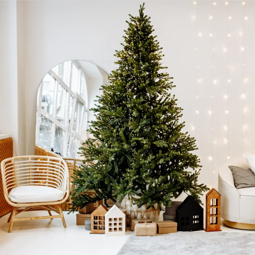 Diamond pine tree, made entirely of high quality PVC film. Well-chosen 3 types of film reflect the natural color of sage, and brown branches of the tree.The needles of our pine tree are about 4 cm long, which makes the tree very fluffy, solid. The pine branches are set on double chromed wire so that even heavy ornaments can be hung on the Christmas tree. The special wire also allows you to spread the crowns of the Christmas tree freely, so that each tree will be unique, and original. The diamond pine tree is decorated with white diamonds imitating real snow, and some of the branches have been dusted with white paint, which does not fall off. To give the Christmas tree a natural look, we added natural pine cones to the tree, which are permanently attached.