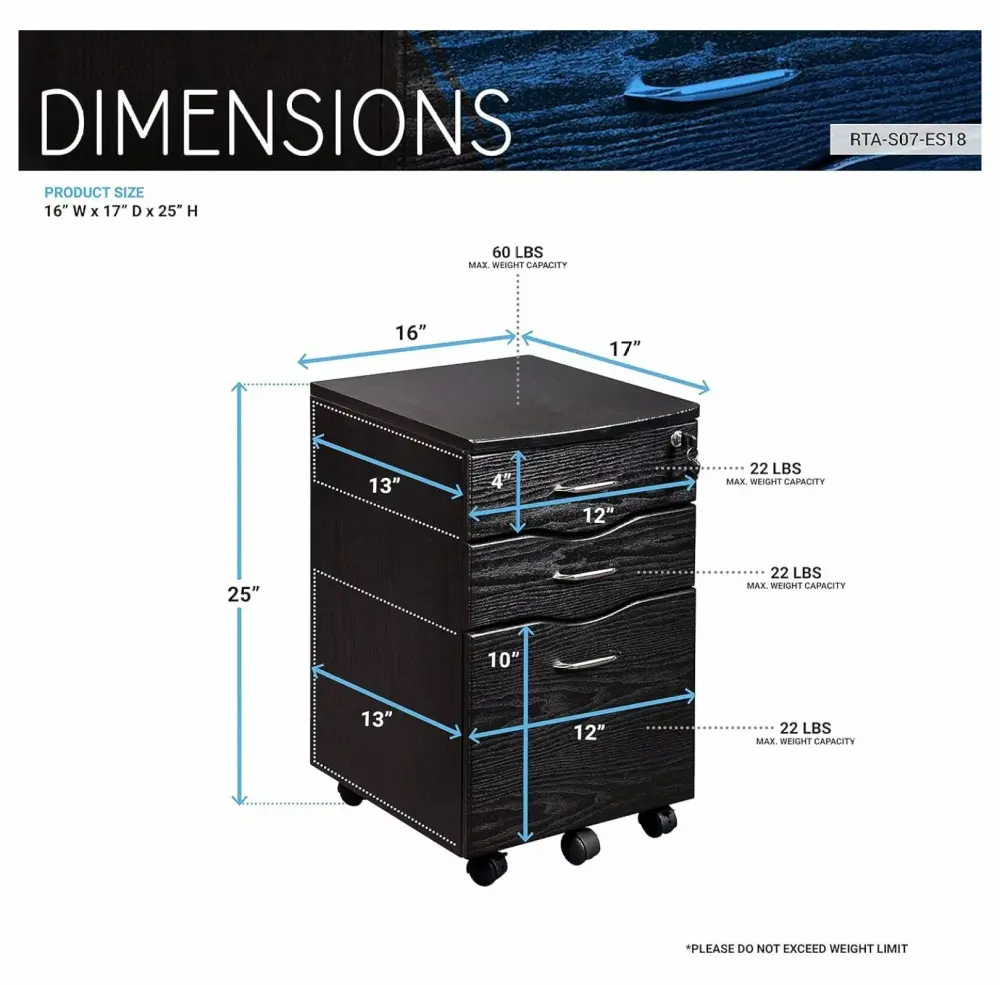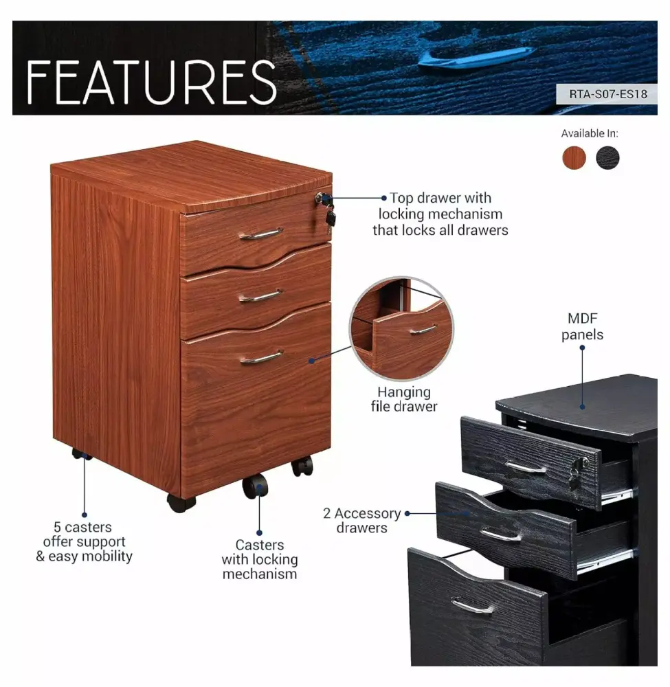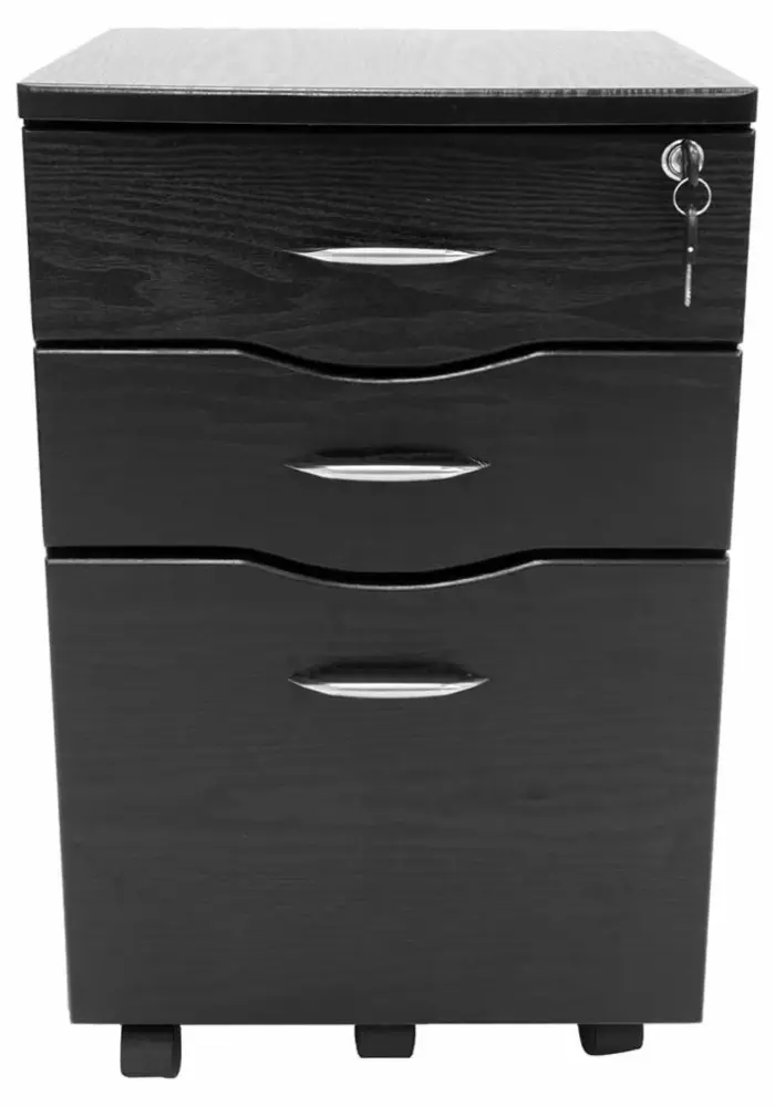 - Top drawer includes a locking mechanism that locks both the drawers and file cabinet