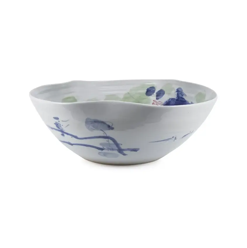 The Swirl Bowl Blue Water Village Small is a unique and beautiful piece. Made from premium-grade porcelain, it is hand crafted, hand fabricated, and hand painted. This bowl is perfect for decorative needs and is an antique reproduction. Its swirl design and blue color make it a charming addition to any home.