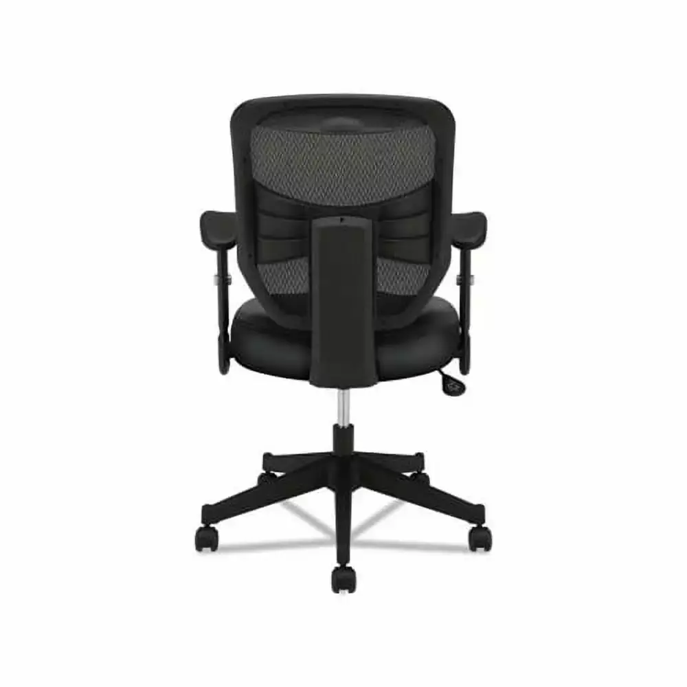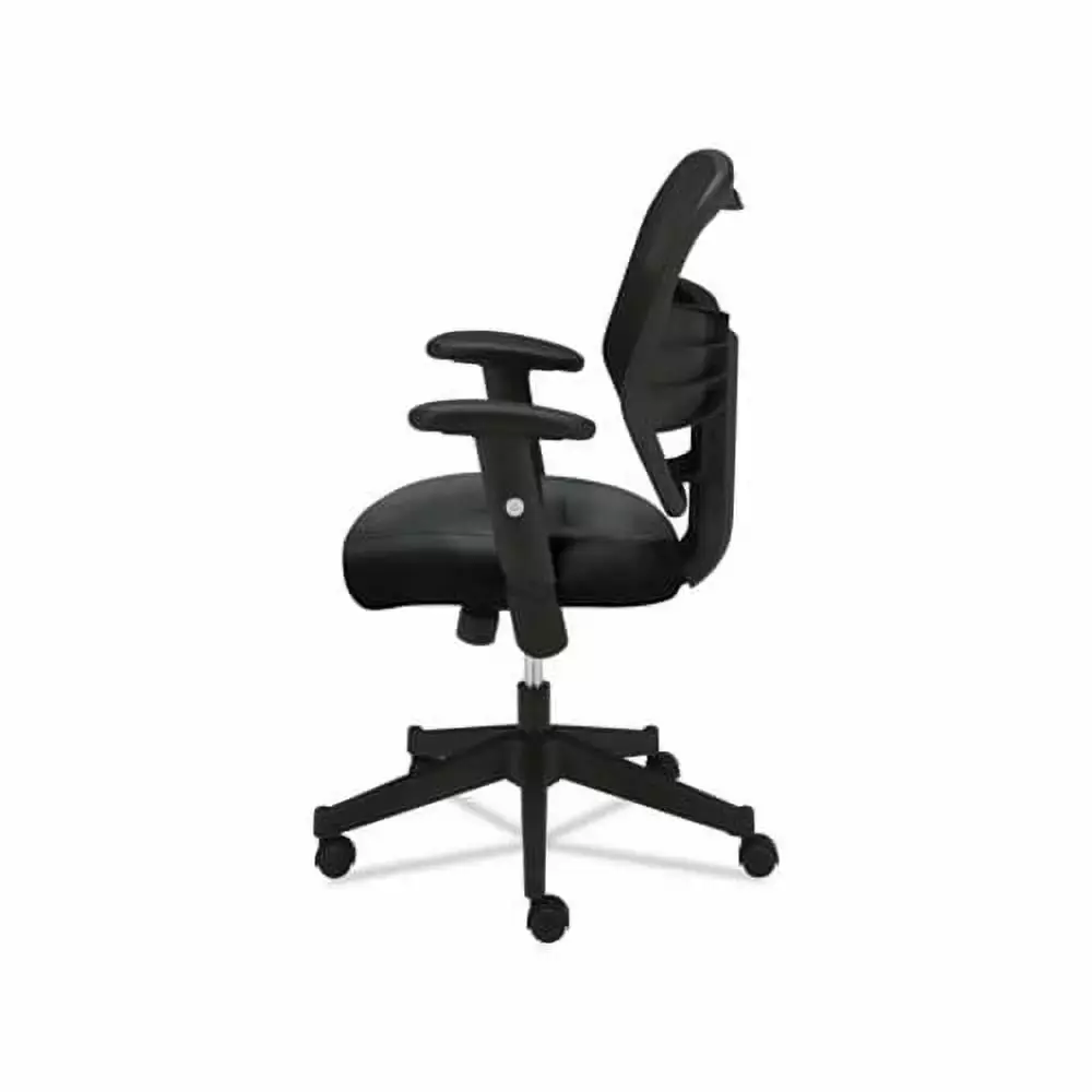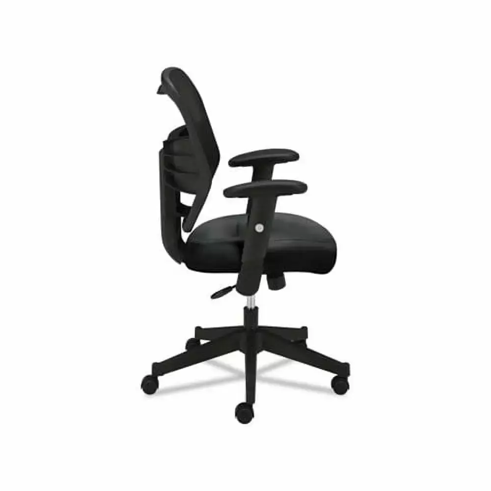 Form and function combined. Dramatic mesh back design offers cool. breathable support. Seat cushion has two layers of padding for increased comfort. Padded arms are height-adjustable for a custom fit. Five-star base with casters for easy mobility. Recommended Applications: Guest. Reception. Waiting Room & Lounge Seat Color: Black Back Color: Black Color Family: Black.