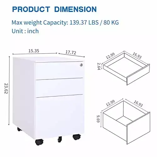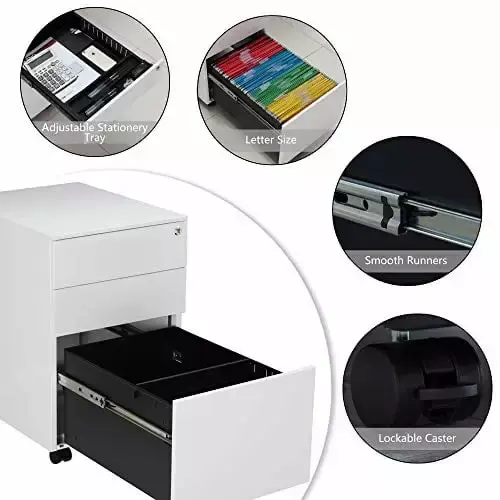 3 Drawer File Cabinet with Wheels. Steel Mobile File Cabinet with Lock Key. Under Desk Rolling Storage for Supplies. Files. and Materials. Mobile Space Saving for Home and Office (White)