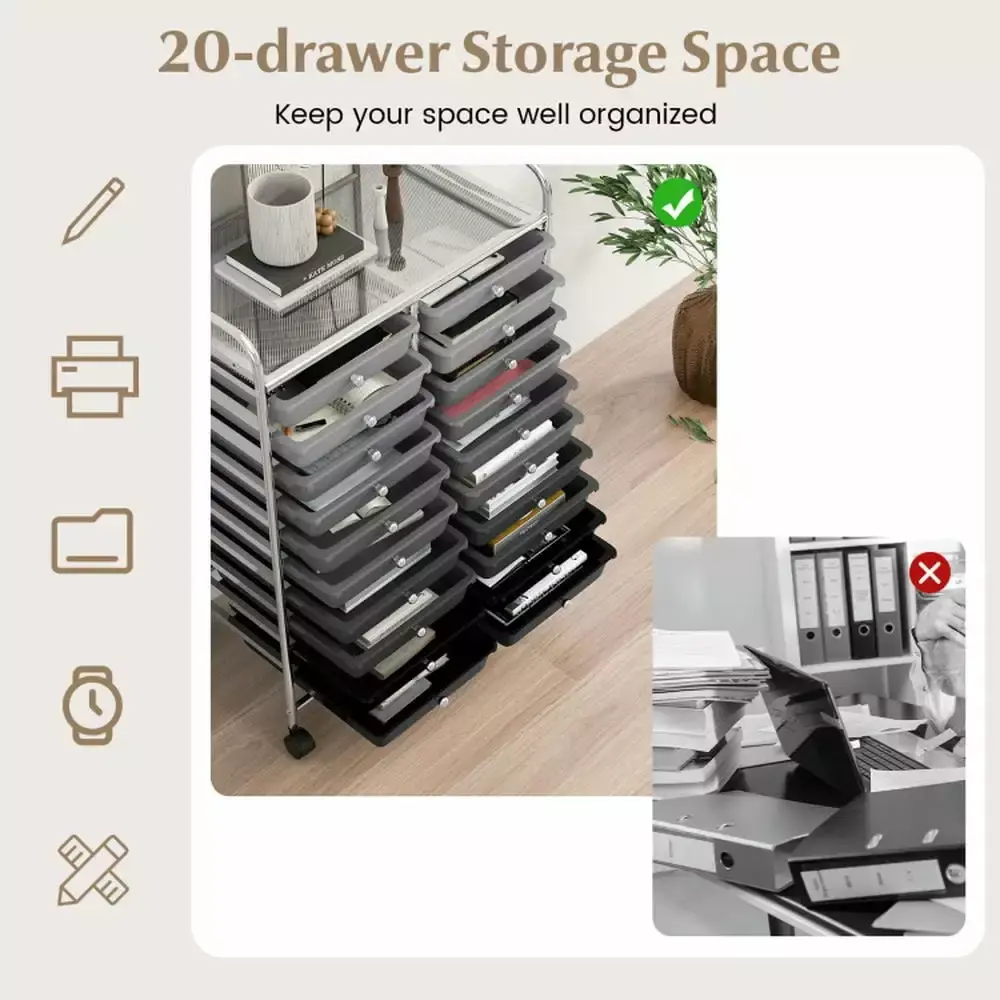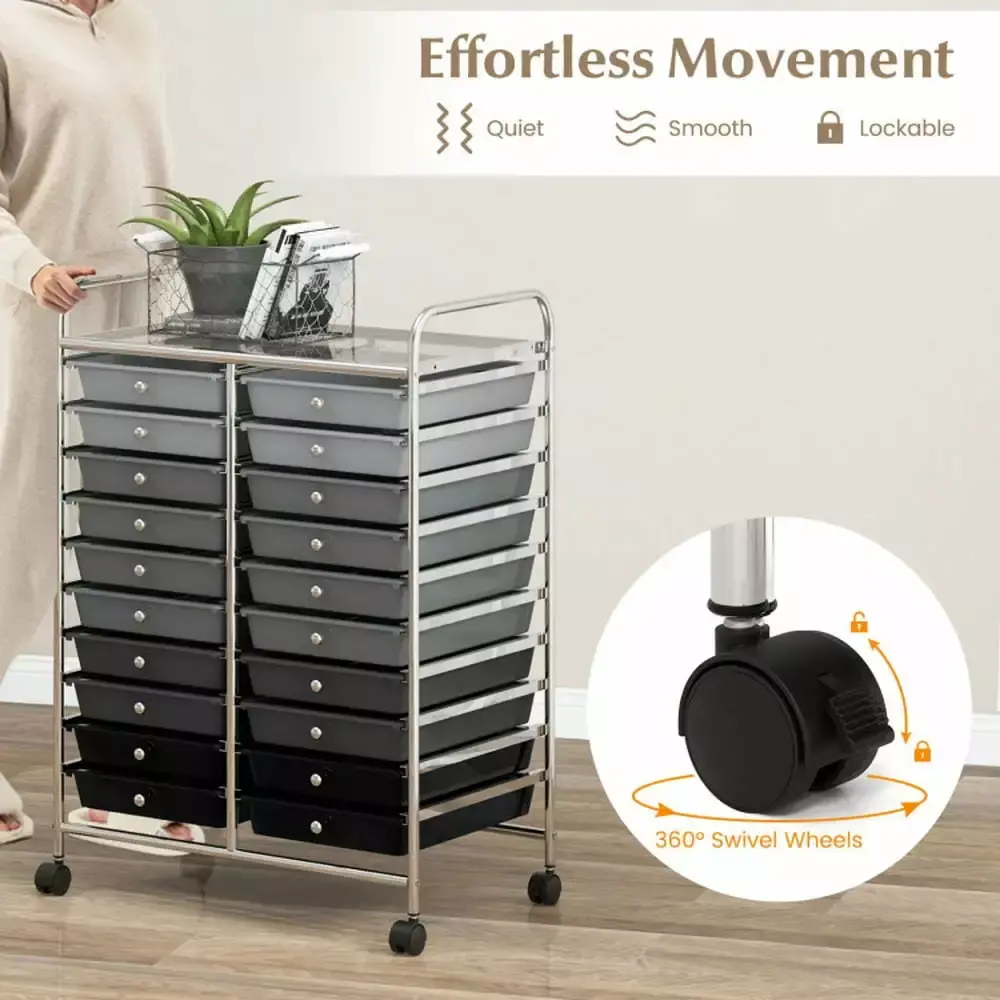 -20 removable drawers for storage and classify-Metal frame and plastic drawers durable and can be used for long time-4 universal wheels (2 with lock) for easy movement and fixation-Drawers slide through metal channels with no resistance-Drawer with knob for easy closing and opening-Easy to pull or push the cart with 2 handles on the top-Spacious storage space on the top of the cart-Ideal drawer storage cart for home office garage and school-Drawers are easy to clean with soap and a damp cloth-Easy to assemble in short time according to instruction